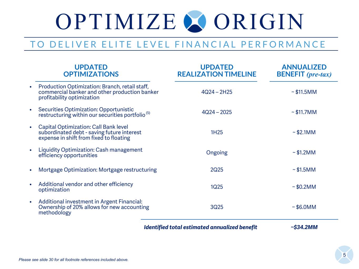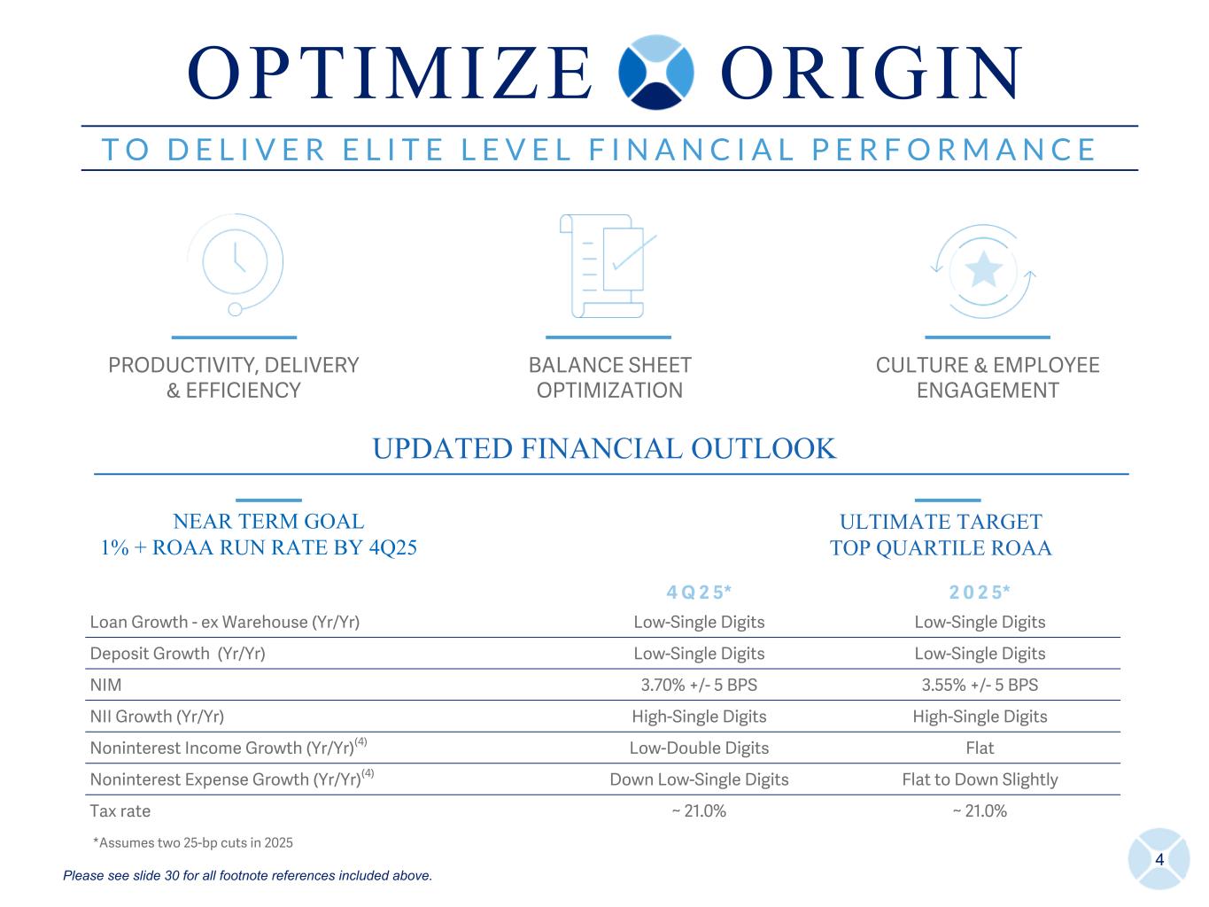 4 T O D E L I V E R E L I T E L E V E L F I N A N C I A L P E R F O R M A N C E T O D E L I V E R E L I T E L E V E L F I N A N C I A L P E R F O R M A N C E PRODUCTIVITY, DELIVERY & EFFICIENCY BALANCE SHEET OPTIMIZATION CULTURE & EMPLOYEE ENGAGEMENT UPDATED FINANCIAL OUTLOOK 4 Q 2 5* 2 0 2 5* Loan Growth - ex Warehouse (Yr/Yr) Low-Single Digits Low-Single Digits Deposit Growth (Yr/Yr) Low-Single Digits Low-Single Digits NIM 3.70% +/- 5 BPS 3.55% +/- 5 BPS NII Growth (Yr/Yr) High-Single Digits High-Single Digits Noninterest Income Growth (Yr/Yr)(4) Low-Double Digits Flat Noninterest Expense Growth (Yr/Yr)(4) Down Low-Single Digits Flat to Down Slightly Tax rate ~ 21.0% ~ 21.0% *Assumes two 25-bp cuts in 2025 NEAR TERM GOAL 1% + ROAA RUN RATE BY 4Q25 ULTIMATE TARGET TOP QUARTILE ROAA O P T I M I Z E O R I G I N Please see slide 30 for all footnote references included above.