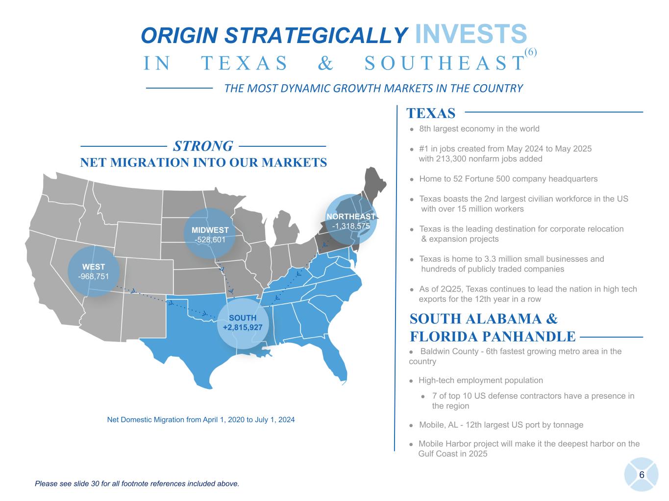 Net Domestic Migration from April 1, 2020 to July 1, 2024 STRONG NET MIGRATION INTO OUR MARKETS WEST -968,751 MIDWEST -528,601 NORTHEAST -1,318,575 SOUTH +2,815,927 6 TEXAS SOUTH ALABAMA & FLORIDA PANHANDLE l Baldwin County - 6th fastest growing metro area in the country l High-tech employment population l 7 of top 10 US defense contractors have a presence in the region l Mobile, AL - 12th largest US port by tonnage l Mobile Harbor project will make it the deepest harbor on the Gulf Coast in 2025 l 8th largest economy in the world l #1 in jobs created from May 2024 to May 2025 with 213,300 nonfarm jobs added l Home to 52 Fortune 500 company headquarters l Texas boasts the 2nd largest civilian workforce in the US with over 15 million workers l Texas is the leading destination for corporate relocation & expansion projects l Texas is home to 3.3 million small businesses and hundreds of publicly traded companies l As of 2Q25, Texas continues to lead the nation in high tech exports for the 12th year in a row ORIGIN STRATEGICALLY INVESTS I N T E X A S & S O U T H E A S T THE MOST DYNAMIC GROWTH MARKETS IN THE COUNTRY (6) Please see slide 30 for all footnote references included above.