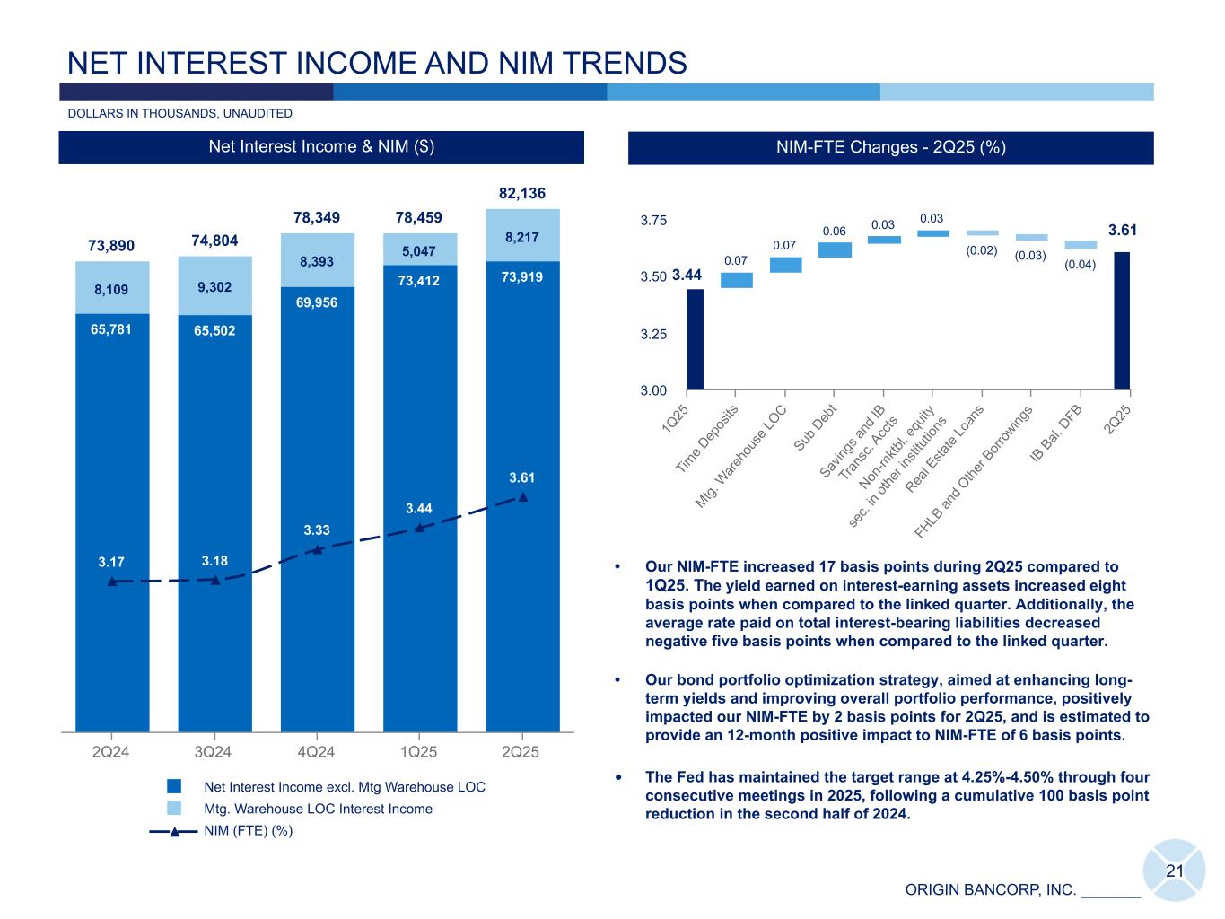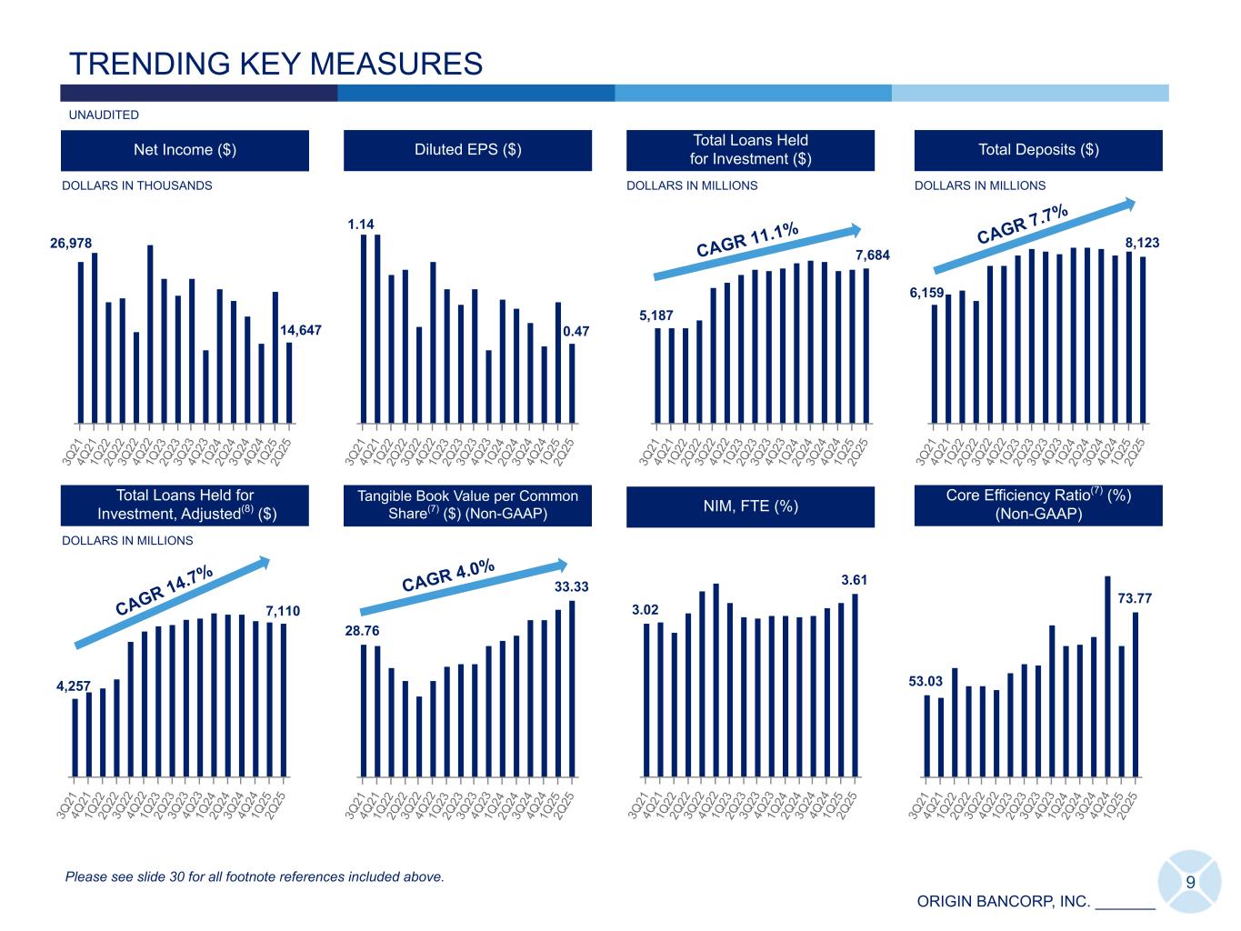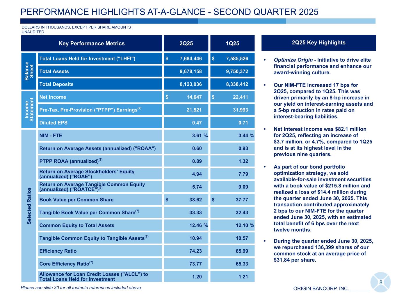 ORIGIN BANCORP, INC. _______ • Optimize Origin - Initiative to drive elite financial performance and enhance our award-winning culture. • Our NIM-FTE increased 17 bps for 2Q25, compared to 1Q25. This was driven primarily by an 8-bp increase in our yield on interest-earning assets and a 5-bp reduction in rates paid on interest-bearing liabilities. • Net interest income was $82.1 million for 2Q25, reflecting an increase of $3.7 million, or 4.7%, compared to 1Q25 and is at its highest level in the previous nine quarters. • As part of our bond portfolio optimization strategy, we sold available-for-sale investment securities with a book value of $215.8 million and realized a loss of $14.4 million during the quarter ended June 30, 2025. This transaction contributed approximately 2 bps to our NIM-FTE for the quarter ended June 30, 2025, with an estimated total benefit of 6 bps over the next twelve months. • During the quarter ended June 30, 2025, we repurchased 136,399 shares of our common stock at an average price of $31.84 per share. Key Performance Metrics 2Q25 1Q25 B al an ce Sh ee t Total Loans Held for Investment ("LHFI") $ 7,684,446 $ 7,585,526 Total Assets 9,678,158 9,750,372 Total Deposits 8,123,036 8,338,412 In co m e St at em en t Net Income $ 14,647 $ 22,411 Pre-Tax, Pre-Provision ("PTPP") Earnings(7) 21,521 31,993 Diluted EPS 0.47 0.71 Se le ct ed R at io s NIM - FTE 3.61 % 3.44 % Return on Average Assets (annualized) ("ROAA") 0.60 0.93 PTPP ROAA (annualized)(7) 0.89 1.32 Return on Average Stockholders’ Equity (annualized) ("ROAE") 4.94 7.79 Return on Average Tangible Common Equity (annualized) ("ROATCE")(7) 5.74 9.09 Book Value per Common Share $ 38.62 $ 37.77 Tangible Book Value per Common Share(7) 33.33 32.43 Common Equity to Total Assets 12.46 % 12.10 % Tangible Common Equity to Tangible Assets(7) 10.94 10.57 Efficiency Ratio 74.23 65.99 Core Efficiency Ratio(7) 73.77 65.33 Allowance for Loan Credit Losses ("ALCL") to Total Loans Held for Investment 1.20 1.21 DOLLARS IN THOUSANDS, EXCEPT PER SHARE AMOUNTS UNAUDITED 8 PERFORMANCE HIGHLIGHTS AT-A-GLANCE - SECOND QUARTER 2025 2Q25 Key Highlights Please see slide 30 for all footnote references included above.