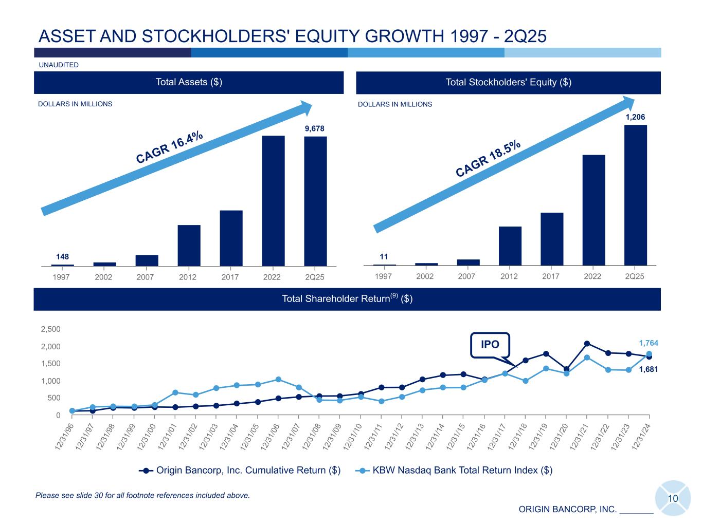 ORIGIN BANCORP, INC. _______ ASSET AND STOCKHOLDERS' EQUITY GROWTH 1997 - 2Q25 DOLLARS IN MILLIONS Total Assets ($) 148 9,678 1997 2002 2007 2012 2017 2022 2Q25 Total Stockholders' Equity ($) 11 1,206 1997 2002 2007 2012 2017 2022 2Q25 CAGR 16.4% CAGR 18.5% 10 1,681 1,764 Origin Bancorp, Inc. Cumulative Return ($) KBW Nasdaq Bank Total Return Index ($) 12 /3 1/ 96 12 /3 1/ 97 12 /3 1/ 98 12 /3 1/ 99 12 /3 1/ 00 12 /3 1/ 01 12 /3 1/ 02 12 /3 1/ 03 12 /3 1/ 04 12 /3 1/ 05 12 /3 1/ 06 12 /3 1/ 07 12 /3 1/ 08 12 /3 1/ 09 12 /3 1/ 10 12 /3 1/ 11 12 /3 1/ 12 12 /3 1/ 13 12 /3 1/ 14 12 /3 1/ 15 12 /3 1/ 16 12 /3 1/ 17 12 /3 1/ 18 12 /3 1/ 19 12 /3 1/ 20 12 /3 1/ 21 12 /3 1/ 22 12 /3 1/ 23 12 /3 1/ 24 0 500 1,000 1,500 2,000 2,500 Total Shareholder Return(9) ($) IPO Please see slide 30 for all footnote references included above. DOLLARS IN MILLIONS UNAUDITED
