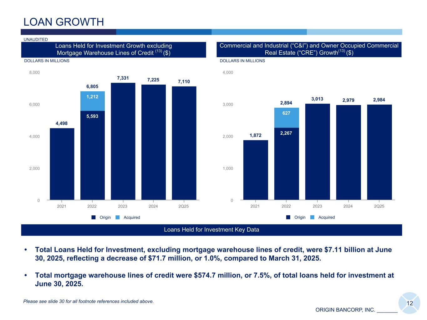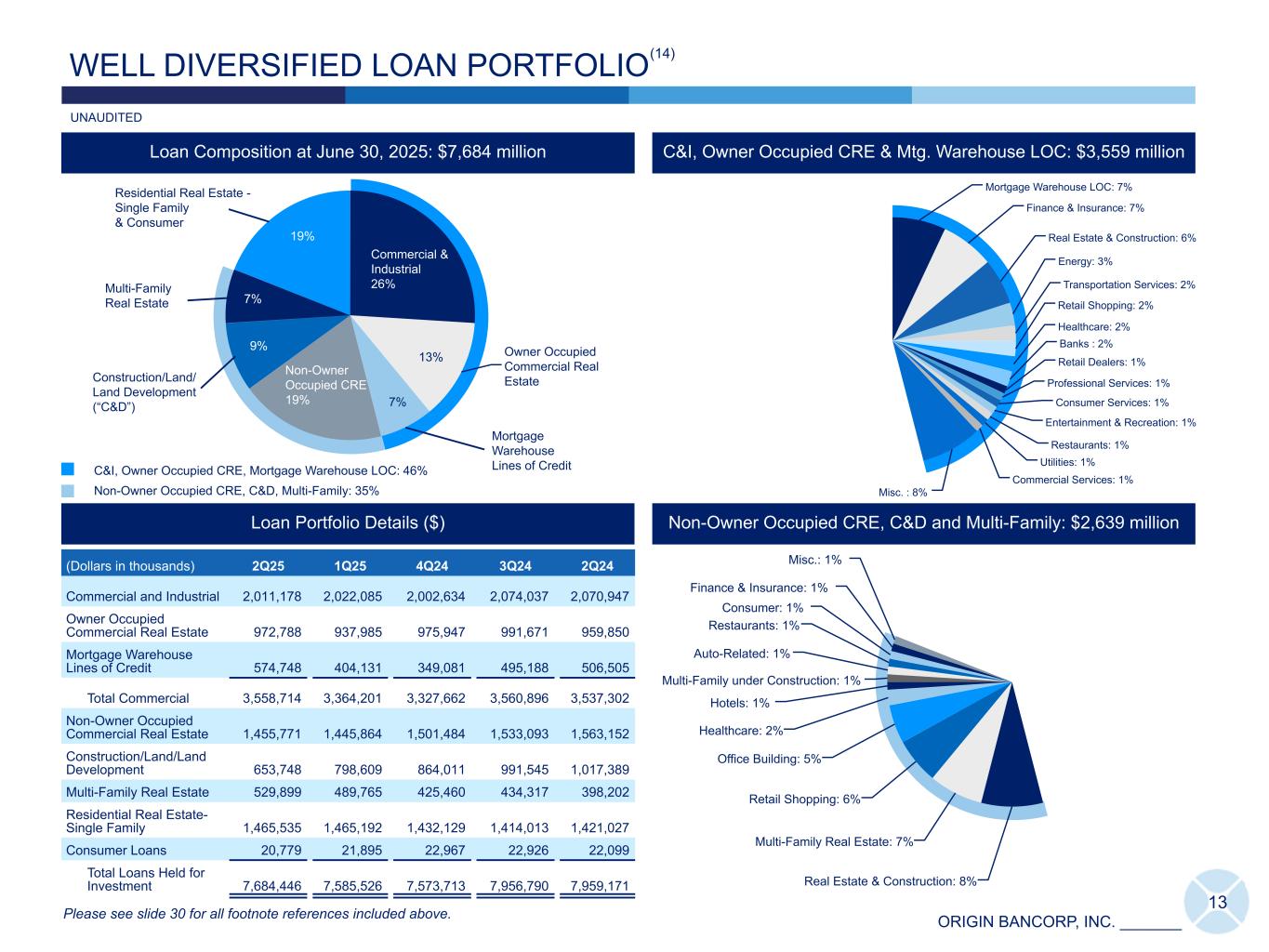 ORIGIN BANCORP, INC. _______ 12 LOAN GROWTH 4,498 6,805 7,331 7,225 7,110 4,498 5,593 7,225 7,110 1,212 Origin Acquired 2021 2022 2023 2024 2Q25 0 2,000 4,000 6,000 8,000 Loans Held for Investment Key Data DOLLARS IN MILLIONS IDT • Total Loans Held for Investment, excluding mortgage warehouse lines of credit, were $7.11 billion at June 30, 2025, reflecting a decrease of $71.7 million, or 1.0%, compared to March 31, 2025. • Total mortgage warehouse lines of credit were $574.7 million, or 7.5%, of total loans held for investment at June 30, 2025. Loans Held for Investment Growth excluding Mortgage Warehouse Lines of Credit (13) ($) 1,872 2,894 3,013 2,979 2,984 1,872 2,267 2,979 2,984627 Origin Acquired 2021 2022 2023 2024 2Q25 0 1,000 2,000 3,000 4,000 Commercial and Industrial (“C&I”) and Owner Occupied Commercial Real Estate (“CRE”) Growth(13) ($) Please see slide 30 for all footnote references included above. DOLLARS IN MILLIONS UNAUDITED