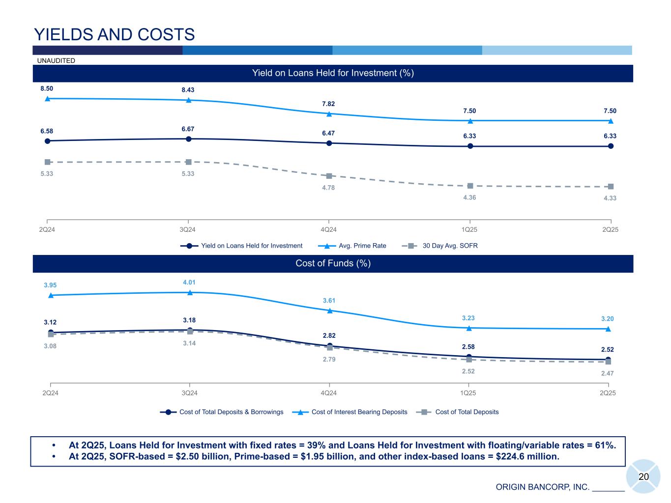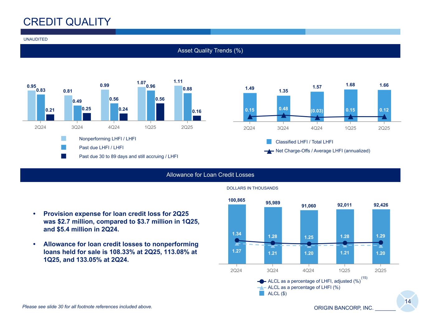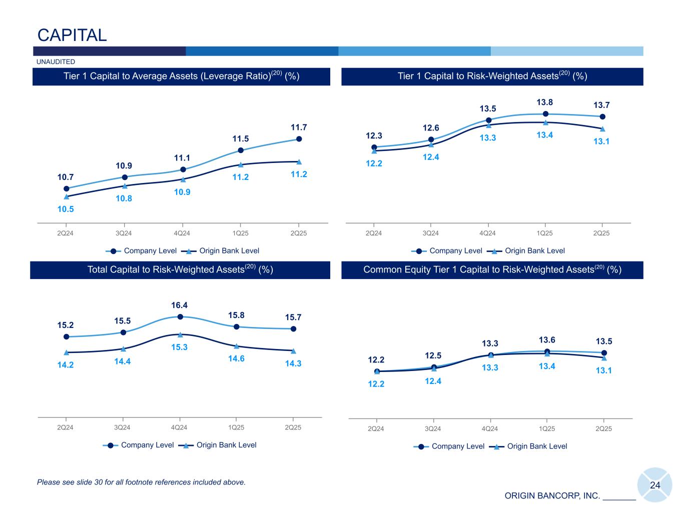 ORIGIN BANCORP, INC. _______ 10.7 10.9 11.1 11.5 11.7 10.5 10.8 10.9 11.2 11.2 Company Level Origin Bank Level 2Q24 3Q24 4Q24 1Q25 2Q25 12.3 12.6 13.5 13.8 13.7 12.2 12.4 13.3 13.4 13.1 Company Level Origin Bank Level 2Q24 3Q24 4Q24 1Q25 2Q25 24 CAPITAL 15.2 15.5 16.4 15.8 15.7 14.2 14.4 15.3 14.6 14.3 Company Level Origin Bank Level 2Q24 3Q24 4Q24 1Q25 2Q25 Common Equity Tier 1 Capital to Risk-Weighted Assets(20) (%) ICap ICap Total Capital to Risk-Weighted Assets(20) (%) Tier 1 Capital to Risk-Weighted Assets(20) (%)Tier 1 Capital to Average Assets (Leverage Ratio)(20) (%) Please see slide 30 for all footnote references included above. UNAUDITED 12.2 12.5 13.3 13.6 13.5 12.2 12.4 13.3 13.4 13.1 Company Level Origin Bank Level 2Q24 3Q24 4Q24 1Q25 2Q25