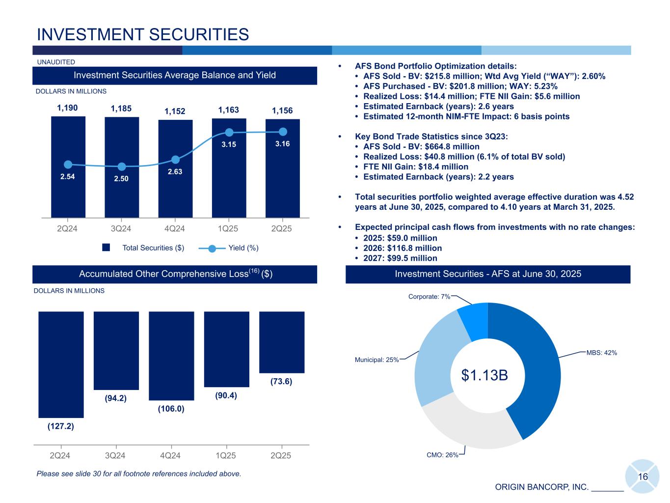 ORIGIN BANCORP, INC. _______ MBS: 42% CMO: 26% Municipal: 25% Corporate: 7% 1,190 1,185 1,152 1,163 1,156 2.54 2.50 2.63 3.15 3.16 Total Securities ($) Yield (%) 2Q24 3Q24 4Q24 1Q25 2Q25 Investment Securities Average Balance and Yield INVESTMENT SECURITIES DOLLARS IN MILLIONS • AFS Bond Portfolio Optimization details: • AFS Sold - BV: $215.8 million; Wtd Avg Yield (“WAY”): 2.60% • AFS Purchased - BV: $201.8 million; WAY: 5.23% • Realized Loss: $14.4 million; FTE NII Gain: $5.6 million • Estimated Earnback (years): 2.6 years • Estimated 12-month NIM-FTE Impact: 6 basis points • Key Bond Trade Statistics since 3Q23: • AFS Sold - BV: $664.8 million • Realized Loss: $40.8 million (6.1% of total BV sold) • FTE NII Gain: $18.4 million • Estimated Earnback (years): 2.2 years • Total securities portfolio weighted average effective duration was 4.52 years at June 30, 2025, compared to 4.10 years at March 31, 2025. • Expected principal cash flows from investments with no rate changes: • 2025: $59.0 million • 2026: $116.8 million • 2027: $99.5 million 16 (127.2) (94.2) (106.0) (90.4) (73.6) 2Q24 3Q24 4Q24 1Q25 2Q25 Accumulated Other Comprehensive Loss(16) ($) Investment Securities - AFS at June 30, 2025 Please see slide 30 for all footnote references included above. $1.13B DOLLARS IN MILLIONS UNAUDITED
