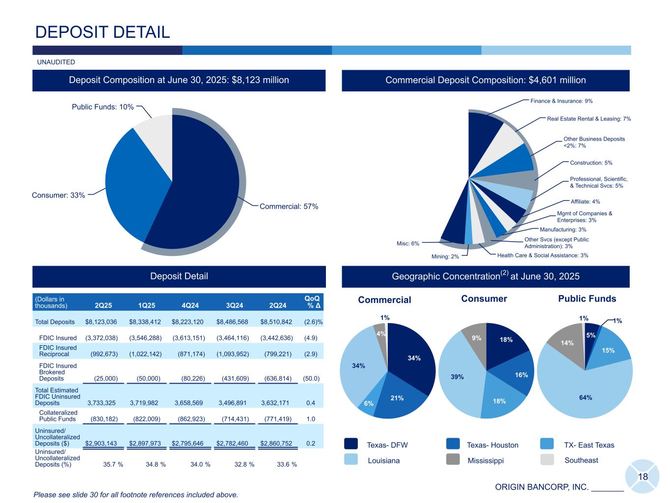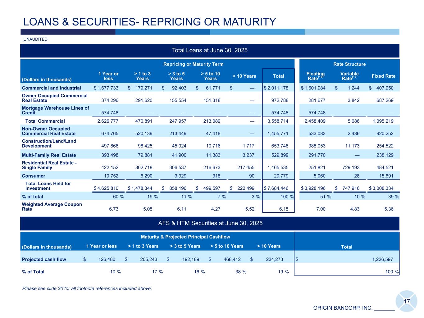 ORIGIN BANCORP, INC. _______ Total Loans at June 30, 2025 (Dollars in thousands) Repricing or Maturity Term Rate Structure 1 Year or less > 1 to 3 Years > 3 to 5 Years > 5 to 10 Years > 10 Years Total Floating Rate(17) Variable Rate(17) Fixed Rate Commercial and industrial $ 1,677,733 $ 179,271 $ 92,403 $ 61,771 $ — $ 2,011,178 $ 1,601,984 $ 1,244 $ 407,950 Owner Occupied Commercial Real Estate 374,296 291,620 155,554 151,318 — 972,788 281,677 3,842 687,269 Mortgage Warehouse Lines of Credit 574,748 — — — — 574,748 574,748 — — Total Commercial 2,626,777 470,891 247,957 213,089 — 3,558,714 2,458,409 5,086 1,095,219 Non-Owner Occupied Commercial Real Estate 674,765 520,139 213,449 47,418 — 1,455,771 533,083 2,436 920,252 Construction/Land/Land Development 497,866 98,425 45,024 10,716 1,717 653,748 388,053 11,173 254,522 Multi-Family Real Estate 393,498 79,881 41,900 11,383 3,237 529,899 291,770 — 238,129 Residential Real Estate - Single Family 422,152 302,718 306,537 216,673 217,455 1,465,535 251,821 729,193 484,521 Consumer 10,752 6,290 3,329 318 90 20,779 5,060 28 15,691 Total Loans Held for Investment $ 4,625,810 $ 1,478,344 $ 858,196 $ 499,597 $ 222,499 $ 7,684,446 $ 3,928,196 $ 747,916 $ 3,008,334 % of total 60 % 19 % 11 % 7 % 3 % 100 % 51 % 10 % 39 % Weighted Average Coupon Rate 6.73 5.05 6.11 4.27 5.52 6.15 7.00 4.83 5.36 AFS & HTM Securities at June 30, 2025 (Dollars in thousands) Maturity & Projected Principal Cashflow Total1 Year or less > 1 to 3 Years > 3 to 5 Years > 5 to 10 Years > 10 Years Projected cash flow $ 126,480 $ 205,243 $ 192,189 $ 468,412 $ 234,273 $ 1,226,597 % of Total 10 % 17 % 16 % 38 % 19 % 100 % LOANS & SECURITIES- REPRICING OR MATURITY 17 UNAUDITED Please see slide 30 for all footnote references included above.
