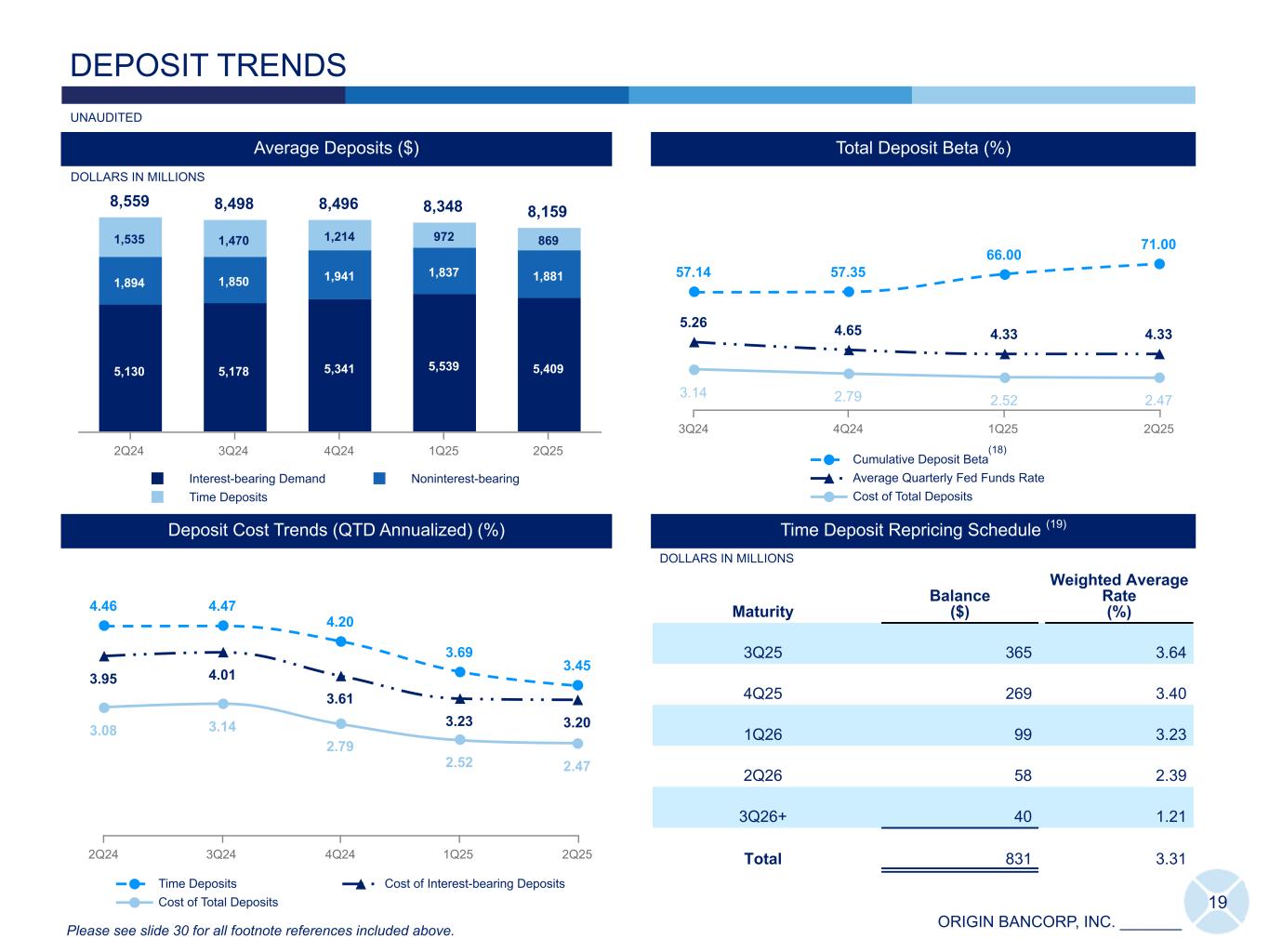 ORIGIN BANCORP, INC. _______ Finance & Insurance: 9% Real Estate Rental & Leasing: 7% Other Business Deposits <2%: 7% Construction: 5% Professional, Scientific, & Technical Svcs: 5% Affiliate: 4% Mgmt of Companies & Enterprises: 3% Manufacturing: 3% Other Svcs (except Public Administration): 3% Health Care & Social Assistance: 3%Mining: 2% Misc: 6% Commercial: 57% Consumer: 33% Public Funds: 10% 34% 21% 6% 34% 4% 1% 5% 1% 15% 64% 14% 1% 18 DEPOSIT DETAIL (Dollars in thousands) 2Q25 1Q25 4Q24 3Q24 2Q24 QoQ % Δ Total Deposits $ 8,123,036 $ 8,486,568 $ 8,510,842 $ 8,505,464 $ 8,251,125 (4.3) % FDIC Insured (3,464,116) (3,464,116) (3,442,636) (3,447,538) (3,425,268) — FDIC Insured Reciprocal (1,093,952) (1,093,952) (799,221) (801,145) (801,699) — FDIC Insured Brokered Deposits (431,609) (431,609) (636,814) (597,110) (444,989) — Total Estimated FDIC Uninsured Deposits 3,133,359 3,496,891 3,632,171 3,659,671 3,579,169 (10.4) Collateralized Public Funds (714,431) (714,431) (771,419) (836,150) (849,603) — Uninsured/ Uncollateralized Deposits ($) $ 2,418,928 $ 2,782,460 $ 2,860,752 $ 2,823,521 $ 2,729,566 (13.1) Uninsured/ Uncollateralized Deposits (%) 29.8 % 32.8 % 33.6 % 33.2 % 33.1 % Deposit Detail Geographic Concentration(2) at June 30, 2025 Commercial Deposit Composition: $4,601 millionDeposit Composition at June 30, 2025: $8,123 million Commercial Public FundsConsumer MississippiLouisiana Texas- DFW TX- East TexasTexas- Houston Please see slide 30 for all footnote references included above. UNAUDITED Southeast 18% 16% 18% 39% 9% (Dollars in thousands) 2Q25 1Q25 4Q24 3Q24 2Q24 QoQ % Δ Total Deposits $ 8,123,036 $ 8,338,412 $ 8,223,120 $ 8,486,568 $ 8,510,842 (2.6) % FDIC Insured (3,372,038) (3,546,288) (3,613,151) (3,464,116) (3,442,636) (4.9) FDIC Insured Reciprocal (992,673) (1,022,142) (871,174) (1,093,952) (799,221) (2.9) FDIC Insured Brokered Deposits (25,000) (50,000) (80,226) (431,609) (636,814) (50.0) Total Estimated FDIC Uninsured Deposits 3,733,325 3,719,982 3,658,569 3,496,891 3,632,171 0.4 Collateralized Public Funds (830,182) (822,009) (862,923) (714,431) (771,419) 1.0 Uninsured/ Uncollateralized Deposits ($) $ 2,903,143 $ 2,897,973 $ 2,795,646 $ 2,782,460 $ 2,860,752 0.2 Uninsured/ Uncollateralized Deposits (%) 35.7 % 34.8 % 34.0 % 32.8 % 33.6 % Deposit Detail