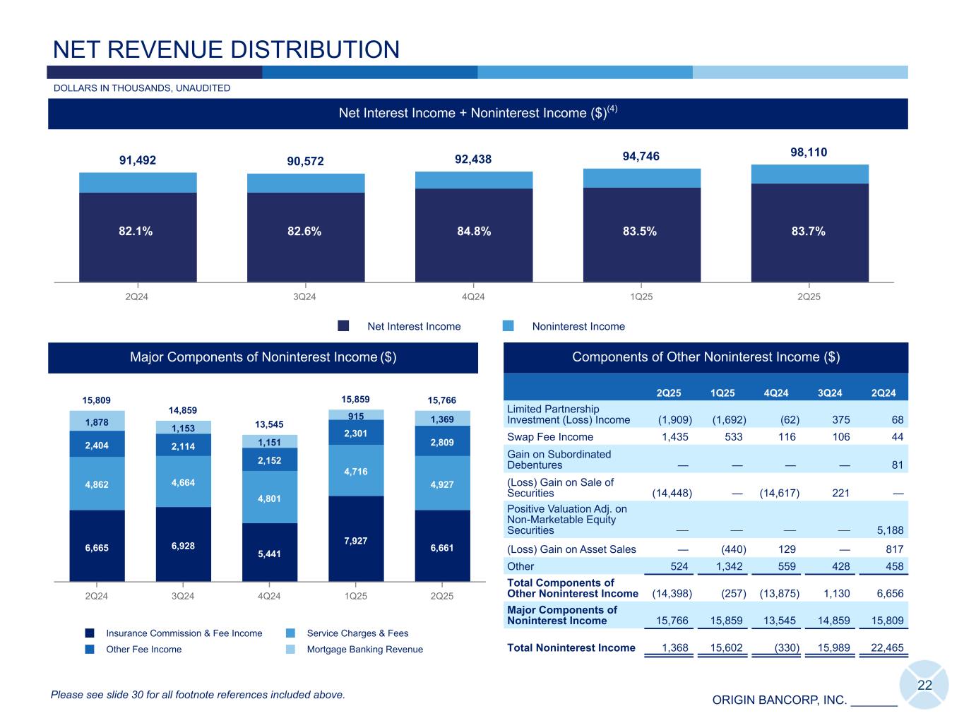 ORIGIN BANCORP, INC. _______ 73,890 74,804 78,349 78,459 82,136 65,781 65,502 69,956 73,412 73,919 8,109 9,302 8,393 5,047 8,217 3.17 3.18 3.33 3.44 3.61 Net Interest Income excl. Mtg Warehouse LOC Mtg. Warehouse LOC Interest Income NIM (FTE) (%) 2Q24 3Q24 4Q24 1Q25 2Q25 21 DOLLARS IN THOUSANDS, UNAUDITED NET INTEREST INCOME AND NIM TRENDS 3.44 0.07 0.07 0.06 0.03 0.03 (0.02) (0.03) (0.04) 1Q 25 Tim e D ep os its Mtg. W ar eh ou se LO C Sub D eb t Sav ing s a nd IB Tr an sc . A cc ts Non -m ktb l. e qu ity se c. in oth er in sti tut ion s Rea l E sta te Lo an s FH LB an d O the r B or ro wing s IB B al. D FB 2Q 25 3.00 3.25 3.50 3.75 24.64 29.52 21.01 8.58 2.041.54 2.480.77 2.18 3.65 4.51 5.26 5.33 5.33 4.65 Cumulative NIM-FTE Beta Average Quarterly Fed Funds Rate 3Q22 4Q22 1Q23 2Q23 4Q23 1Q24 2Q24 3Q24 2Q25 NIM Beta - 2Q25 (%) 2.48 2.48 4.99 NIM-FTE Changes - 2Q25 (%) NIM-FTE Changes - 2Q25 (%) 73,32372,989 1,362 1,537 568 432 (298) (3,267) 4Q 23 RE Lo an s C&I MW LO C Othe r FH LB & O the r Bor ro wing s Sav ing s & IB Tr an sa c. Acc ts. 1Q 24 40,000 60,000 80,000 • Our NIM-FTE increased 17 basis points during 2Q25 compared to 1Q25. The yield earned on interest-earning assets increased eight basis points when compared to the linked quarter. Additionally, the average rate paid on total interest-bearing liabilities decreased negative five basis points when compared to the linked quarter. • Our bond portfolio optimization strategy, aimed at enhancing long- term yields and improving overall portfolio performance, positively impacted our NIM-FTE by 2 basis points for 2Q25, and is estimated to provide an 12-month positive impact to NIM-FTE of 6 basis points. • The Fed has maintained the target range at 4.25%-4.50% through four consecutive meetings in 2025, following a cumulative 100 basis point reduction in the second half of 2024. Net Interest Income & NIM ($) 3.61