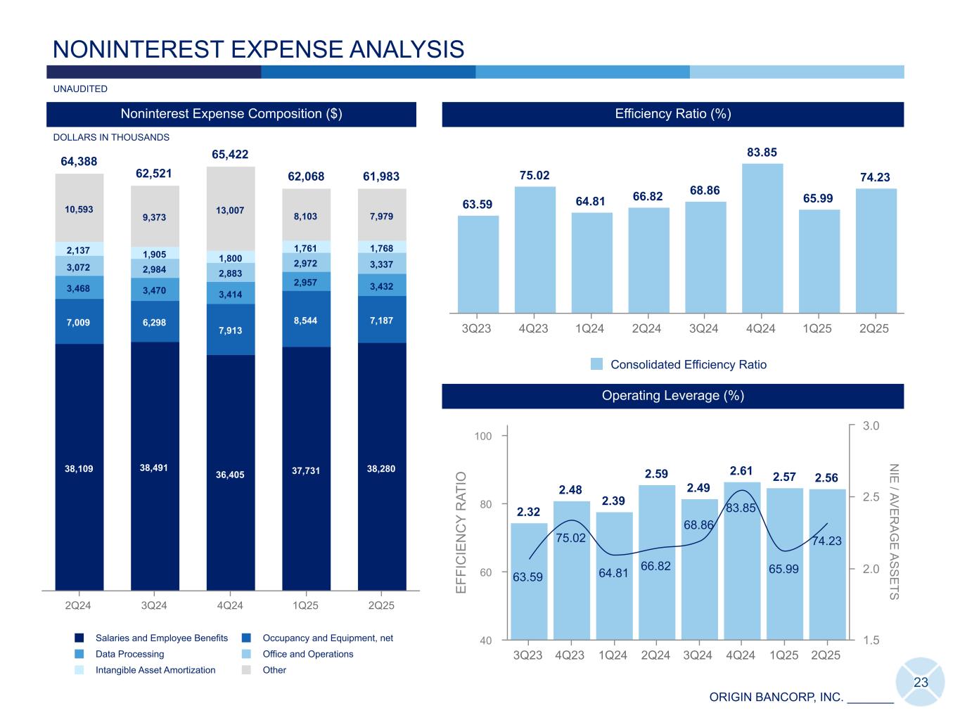 ORIGIN BANCORP, INC. _______ 91,492 90,572 92,438 94,746 98,110 Net Interest Income Noninterest Income 2Q24 3Q24 4Q24 1Q25 2Q25 15,809 14,859 13,545 15,859 15,766 6,665 6,928 5,441 7,927 6,661 4,862 4,664 4,801 4,716 4,927 2,404 2,114 2,152 2,301 2,809 1,878 1,153 1,151 915 1,369 Insurance Commission & Fee Income Service Charges & Fees Other Fee Income Mortgage Banking Revenue 2Q24 3Q24 4Q24 1Q25 2Q25 22 Major Components of Noninterest Income ($) Net Interest Income + Noninterest Income ($)(4) NET REVENUE DISTRIBUTION Components of Other Noninterest Income ($) 2Q25 1Q25 4Q24 3Q24 2Q24 Limited Partnership Investment (Loss) Income (1,909) (1,692) (62) 375 68 Swap Fee Income 1,435 533 116 106 44 Gain on Subordinated Debentures — — — — 81 (Loss) Gain on Sale of Securities (14,448) — (14,617) 221 — Positive Valuation Adj. on Non-Marketable Equity Securities — — — — 5,188 (Loss) Gain on Asset Sales — (440) 129 — 817 Other 524 1,342 559 428 458 Total Components of Other Noninterest Income (14,398) (257) (13,875) 1,130 6,656 Major Components of Noninterest Income 15,766 15,859 13,545 14,859 15,809 Total Noninterest Income 1,368 15,602 (330) 15,989 22,465 82.1% 83.7% Please see slide 30 for all footnote references included above. DOLLARS IN THOUSANDS, UNAUDITED 83.5%84.8%82.6%