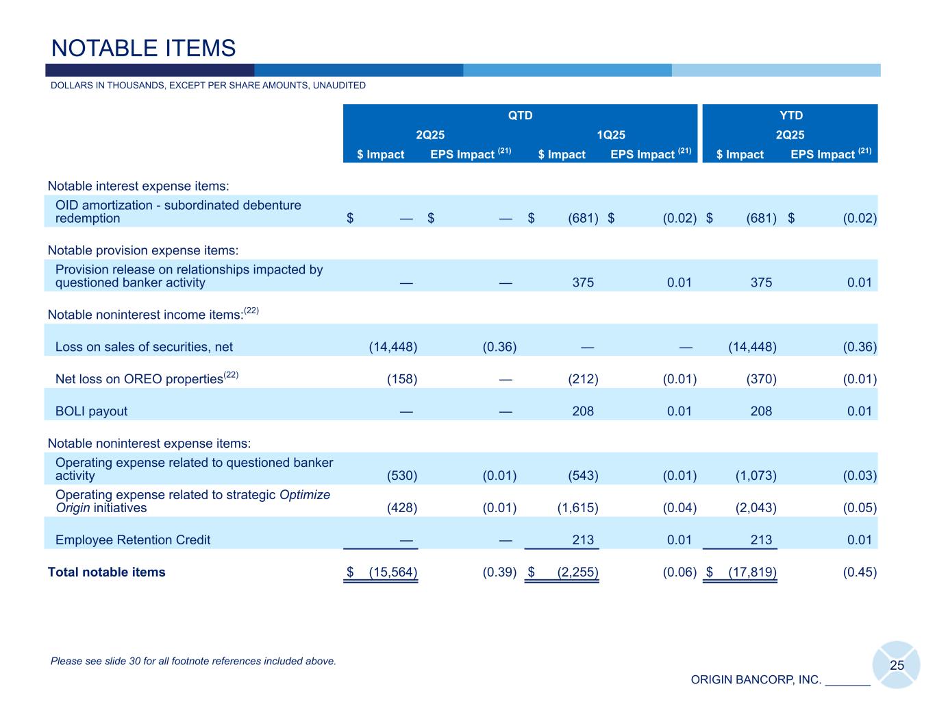 ORIGIN BANCORP, INC. _______ QTD YTD 2Q25 1Q25 2Q25 $ Impact EPS Impact (21) $ Impact EPS Impact (21) $ Impact EPS Impact (21) Notable interest expense items: OID amortization - subordinated debenture redemption $ — $ — $ (681) $ (0.02) $ (681) $ (0.02) Notable provision expense items: Provision release on relationships impacted by questioned banker activity — — 375 0.01 375 0.01 Notable noninterest income items:(22) Loss on sales of securities, net (14,448) (0.36) — — (14,448) (0.36) Net loss on OREO properties(22) (158) — (212) (0.01) (370) (0.01) BOLI payout — — 208 0.01 208 0.01 Notable noninterest expense items: Operating expense related to questioned banker activity (530) (0.01) (543) (0.01) (1,073) (0.03) Operating expense related to strategic Optimize Origin initiatives (428) (0.01) (1,615) (0.04) (2,043) (0.05) Employee Retention Credit — — 213 0.01 213 0.01 Total notable items $ (15,564) (0.39) $ (2,255) (0.06) $ (17,819) (0.45) 25 DOLLARS IN THOUSANDS, EXCEPT PER SHARE AMOUNTS, UNAUDITED NOTABLE ITEMS Please see slide 30 for all footnote references included above.