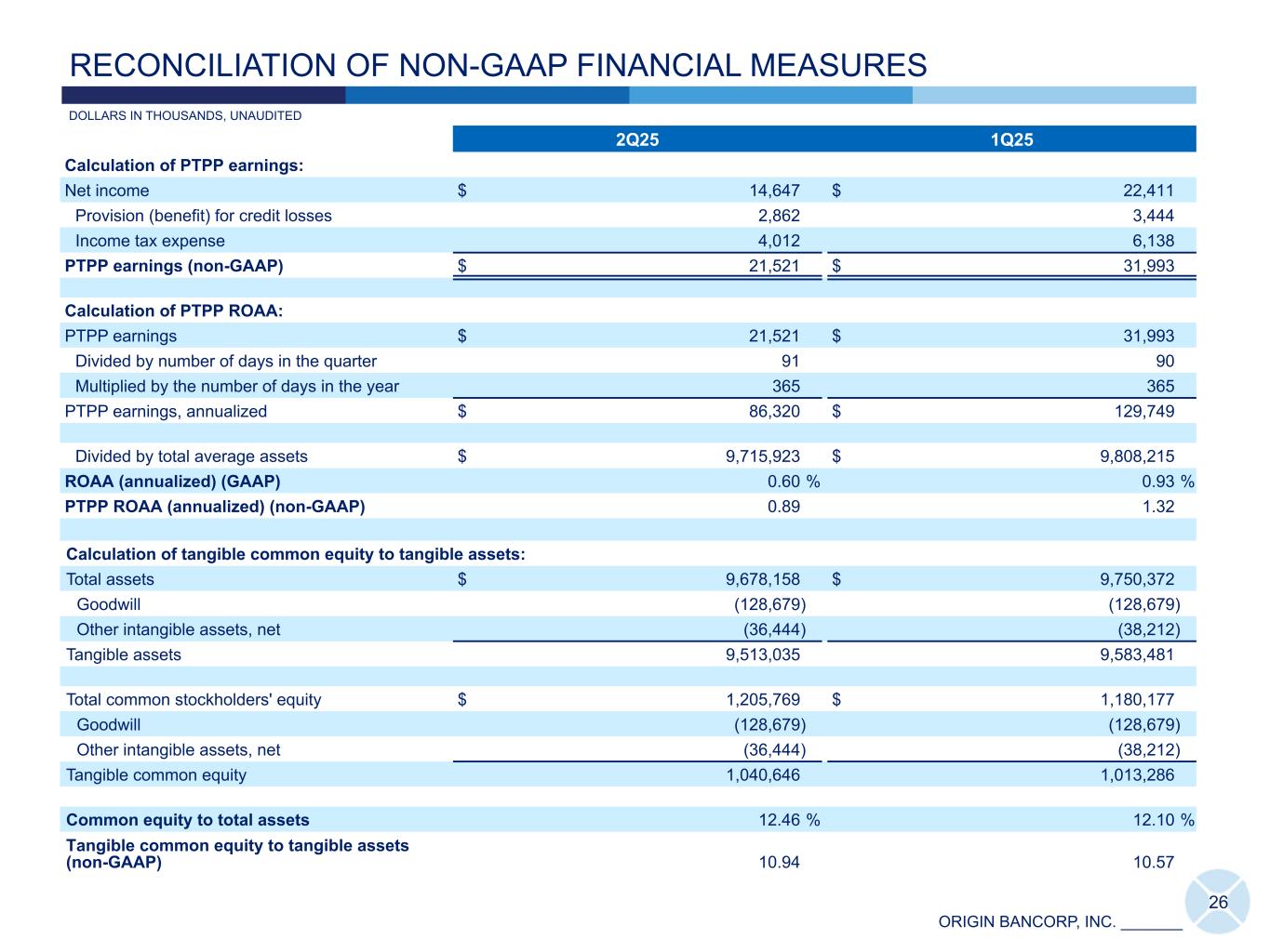 ORIGIN BANCORP, INC. _______ 2Q25 1Q25 Calculation of PTPP earnings: Net income $ 14,647 $ 22,411 Provision (benefit) for credit losses 2,862 3,444 Income tax expense 4,012 6,138 PTPP earnings (non-GAAP) $ 21,521 $ 31,993 Calculation of PTPP ROAA: PTPP earnings $ 21,521 $ 31,993 Divided by number of days in the quarter 91 90 Multiplied by the number of days in the year 365 365 PTPP earnings, annualized $ 86,320 $ 129,749 Divided by total average assets $ 9,715,923 $ 9,808,215 ROAA (annualized) (GAAP) 0.60 % 0.93 % PTPP ROAA (annualized) (non-GAAP) 0.89 1.32 Calculation of tangible common equity to tangible assets: Total assets $ 9,678,158 $ 9,750,372 Goodwill (128,679) (128,679) Other intangible assets, net (36,444) (38,212) Tangible assets 9,513,035 9,583,481 Total common stockholders' equity $ 1,205,769 $ 1,180,177 Goodwill (128,679) (128,679) Other intangible assets, net (36,444) (38,212) Tangible common equity 1,040,646 1,013,286 Common equity to total assets 12.46 % 12.10 % Tangible common equity to tangible assets (non-GAAP) 10.94 10.57 26 DOLLARS IN THOUSANDS, UNAUDITED RECONCILIATION OF NON-GAAP FINANCIAL MEASURES