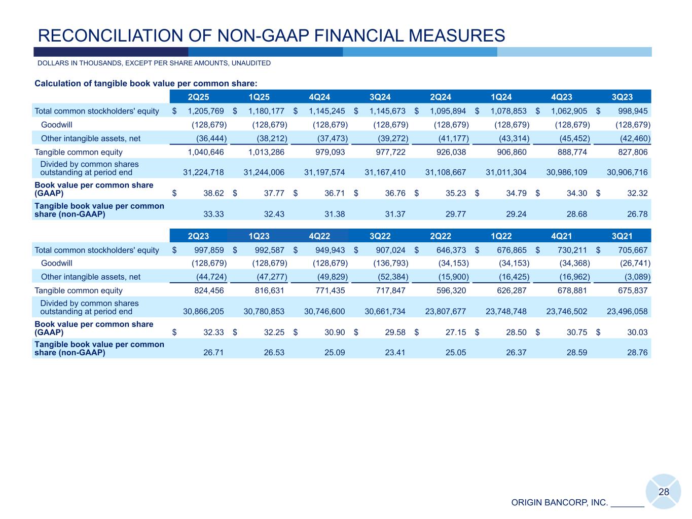 ORIGIN BANCORP, INC. _______ Calculation of tangible book value per common share: 2Q25 1Q25 4Q24 3Q24 2Q24 1Q24 4Q23 3Q23 Total common stockholders' equity $ 1,205,769 $ 1,180,177 $ 1,145,245 $ 1,145,673 $ 1,095,894 $ 1,078,853 $ 1,062,905 $ 998,945 Goodwill (128,679) (128,679) (128,679) (128,679) (128,679) (128,679) (128,679) (128,679) Other intangible assets, net (36,444) (38,212) (37,473) (39,272) (41,177) (43,314) (45,452) (42,460) Tangible common equity 1,040,646 1,013,286 979,093 977,722 926,038 906,860 888,774 827,806 Divided by common shares outstanding at period end 31,224,718 31,244,006 31,197,574 31,167,410 31,108,667 31,011,304 30,986,109 30,906,716 Book value per common share (GAAP) $ 38.62 $ 37.77 $ 36.71 $ 36.76 $ 35.23 $ 34.79 $ 34.30 $ 32.32 Tangible book value per common share (non-GAAP) 33.33 32.43 31.38 31.37 29.77 29.24 28.68 26.78 2Q23 1Q23 4Q22 3Q22 2Q22 1Q22 4Q21 3Q21 Total common stockholders' equity $ 997,859 $ 992,587 $ 949,943 $ 907,024 $ 646,373 $ 676,865 $ 730,211 $ 705,667 Goodwill (128,679) (128,679) (128,679) (136,793) (34,153) (34,153) (34,368) (26,741) Other intangible assets, net (44,724) (47,277) (49,829) (52,384) (15,900) (16,425) (16,962) (3,089) Tangible common equity 824,456 816,631 771,435 717,847 596,320 626,287 678,881 675,837 Divided by common shares outstanding at period end 30,866,205 30,780,853 30,746,600 30,661,734 23,807,677 23,748,748 23,746,502 23,496,058 Book value per common share (GAAP) $ 32.33 $ 32.25 $ 30.90 $ 29.58 $ 27.15 $ 28.50 $ 30.75 $ 30.03 Tangible book value per common share (non-GAAP) 26.71 26.53 25.09 23.41 25.05 26.37 28.59 28.76 28 RECONCILIATION OF NON-GAAP FINANCIAL MEASURES DOLLARS IN THOUSANDS, EXCEPT PER SHARE AMOUNTS, UNAUDITED