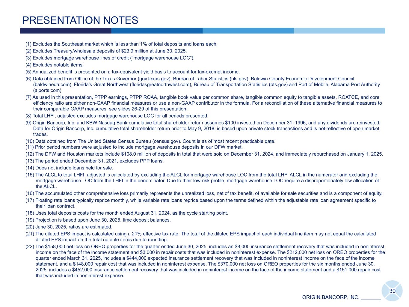 ORIGIN BANCORP, INC. _______ 30 PRESENTATION NOTES (1) Excludes the Southeast market which is less than 1% of total deposits and loans each. (2) Excludes Treasury/wholesale deposits of $23.9 million at June 30, 2025. (3) Excludes mortgage warehouse lines of credit (“mortgage warehouse LOC”). (4) Excludes notable items. (5) Annualized benefit is presented on a tax-equivalent yield basis to account for tax-exempt income. (6) Data obtained from Office of the Texas Governor (gov.texas.gov), Bureau of Labor Statistics (bls.gov), Baldwin County Economic Development Council (baldwineda.com), Florida's Great Northwest (floridasgreatnorthwest.com), Bureau of Transportation Statistics (bts.gov) and Port of Mobile, Alabama Port Authority (alports.com). (7) As used in this presentation, PTPP earnings, PTPP ROAA, tangible book value per common share, tangible common equity to tangible assets, ROATCE, and core efficiency ratio are either non-GAAP financial measures or use a non-GAAP contributor in the formula. For a reconciliation of these alternative financial measures to their comparable GAAP measures, see slides 26-29 of this presentation. (8) Total LHFI, adjusted excludes mortgage warehouse LOC for all periods presented. (9) Origin Bancorp, Inc. and KBW Nasdaq Bank cumulative total shareholder return assumes $100 invested on December 31, 1996, and any dividends are reinvested. Data for Origin Bancorp, Inc. cumulative total shareholder return prior to May 9, 2018, is based upon private stock transactions and is not reflective of open market trades. (10) Data obtained from The United States Census Bureau (census.gov). Count is as of most recent practicable date. (11) Prior period numbers were adjusted to include mortgage warehouse deposits in our DFW market. (12) The DFW and Houston markets include $108.0 million of deposits in total that were sold on December 31, 2024, and immediately repurchased on January 1, 2025. (13) The period ended December 31, 2021, excludes PPP loans. (14) Does not include loans held for sale. (15) The ALCL to total LHFI, adjusted is calculated by excluding the ALCL for mortgage warehouse LOC from the total LHFI ALCL in the numerator and excluding the mortgage warehouse LOC from the LHFI in the denominator. Due to their low-risk profile, mortgage warehouse LOC require a disproportionately low allocation of the ALCL. (16) The accumulated other comprehensive loss primarily represents the unrealized loss, net of tax benefit, of available for sale securities and is a component of equity. (17) Floating rate loans typically reprice monthly, while variable rate loans reprice based upon the terms defined within the adjustable rate loan agreement specific to their loan contract. (18) Uses total deposits costs for the month ended August 31, 2024, as the cycle starting point. (19) Projection is based upon June 30, 2025, time deposit balances. (20) June 30, 2025, ratios are estimated. (21) The diluted EPS impact is calculated using a 21% effective tax rate. The total of the diluted EPS impact of each individual line item may not equal the calculated diluted EPS impact on the total notable items due to rounding. (22) The $158,000 net loss on OREO properties for the quarter ended June 30, 2025, includes an $8,000 insurance settlement recovery that was included in noninterest income on the face of the income statement and $3,000 in repair costs that was included in noninterest expense. The $212,000 net loss on OREO properties for the quarter ended March 31, 2025, includes a $444,000 expected insurance settlement recovery that was included in noninterest income on the face of the income statement, and a $148,000 repair cost that was included in noninterest expense. The $370,000 net loss on OREO properties for the six months ended June 30, 2025, includes a $452,000 insurance settlement recovery that was included in noninterest income on the face of the income statement and a $151,000 repair cost that was included in noninterest expense.