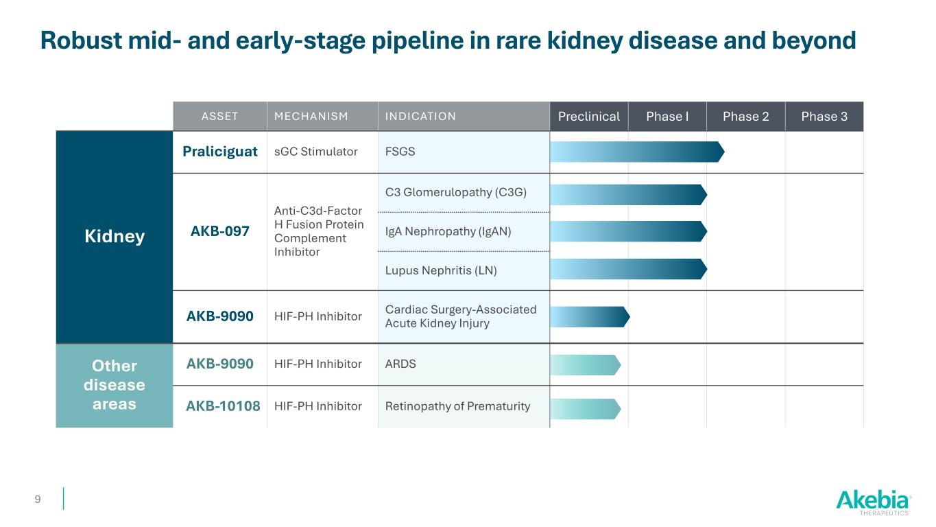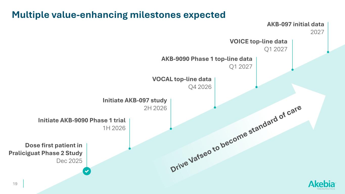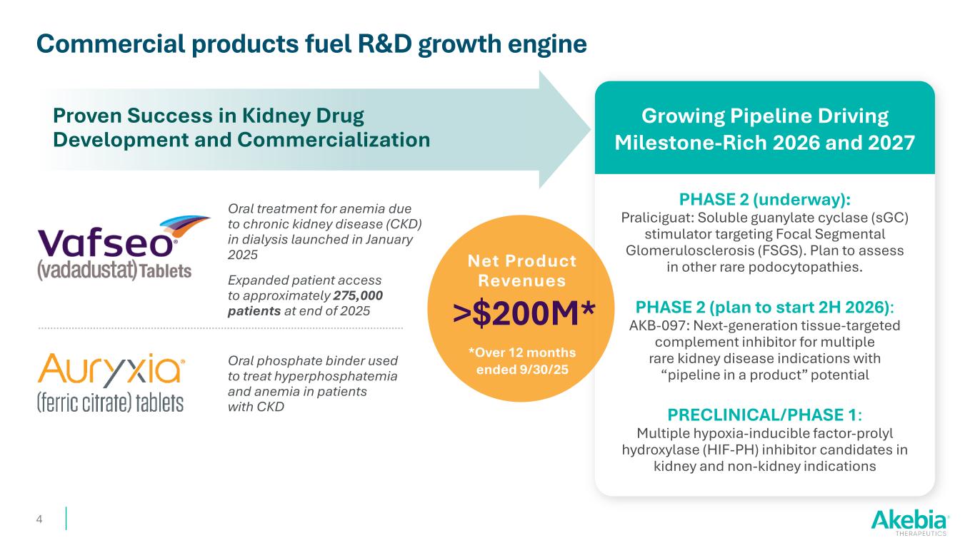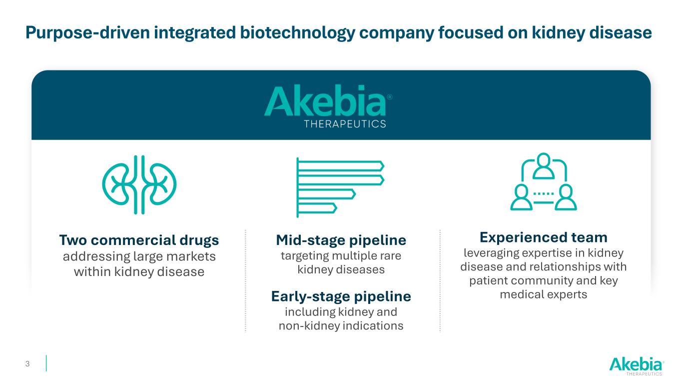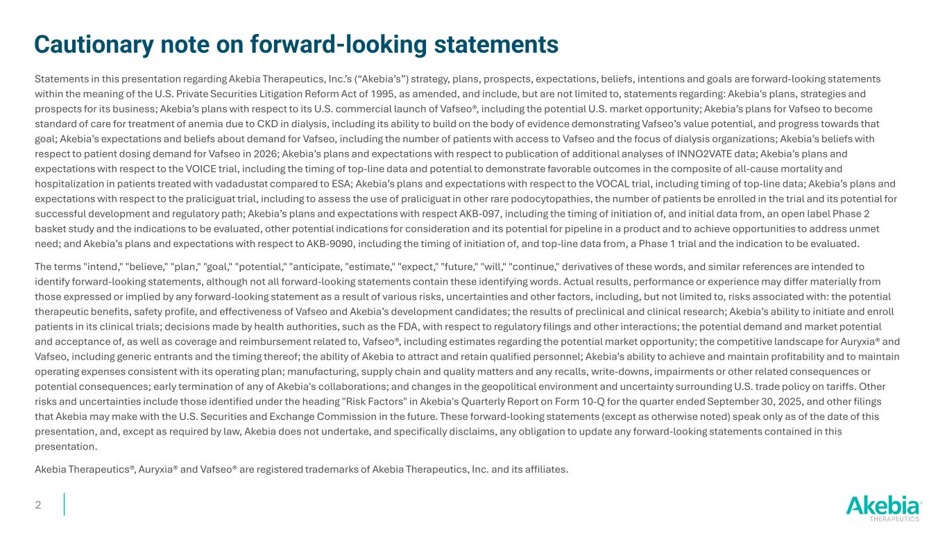 Cautionary note on forward-looking statements Statements in this presentation regarding Akebia Therapeutics, Inc.’s (“Akebia’s”) strategy, plans, prospects, expectations, beliefs, intentions and goals are forward-looking statements within the meaning of the U.S. Private Securities Litigation Reform Act of 1995, as amended, and include, but are not limited to, statements regarding: Akebia's plans, strategies and prospects for its business; Akebia’s plans with respect to its U.S. commercial launch of Vafseo®, including the potential U.S. market opportunity; Akebia’s plans for Vafseo to become standard of care for treatment of anemia due to CKD in dialysis, including its ability to build on the body of evidence demonstrating Vafseo’s value potential, and progress towards that goal; Akebia’s expectations and beliefs about demand for Vafseo, including the number of patients with access to Vafseo and the focus of dialysis organizations; Akebia’s beliefs with respect to patient dosing demand for Vafseo in 2026; Akebia’s plans and expectations with respect to publication of additional analyses of INNO2VATE data; Akebia’s plans and expectations with respect to the VOICE trial, including the timing of top-line data and potential to demonstrate favorable outcomes in the composite of all-cause mortality and hospitalization in patients treated with vadadustat compared to ESA; Akebia’s plans and expectations with respect to the VOCAL trial, including timing of top-line data; Akebia’s plans and expectations with respect to the praliciguat trial, including to assess the use of praliciguat in other rare podocytopathies, the number of patients be enrolled in the trial and its potential for successful development and regulatory path; Akebia’s plans and expectations with respect AKB-097, including the timing of initiation of, and initial data from, an open label Phase 2 basket study and the indications to be evaluated, other potential indications for consideration and its potential for pipeline in a product and to achieve opportunities to address unmet need; and Akebia’s plans and expectations with respect to AKB-9090, including the timing of initiation of, and top-line data from, a Phase 1 trial and the indication to be evaluated. The terms "intend," "believe," "plan," "goal," "potential," "anticipate, "estimate," "expect," "future," "will," "continue," derivatives of these words, and similar references are intended to identify forward-looking statements, although not all forward-looking statements contain these identifying words. Actual results, performance or experience may differ materially from those expressed or implied by any forward-looking statement as a result of various risks, uncertainties and other factors, including, but not limited to, risks associated with: the potential therapeutic benefits, safety profile, and effectiveness of Vafseo and Akebia’s development candidates; the results of preclinical and clinical research; Akebia’s ability to initiate and enroll patients in its clinical trials; decisions made by health authorities, such as the FDA, with respect to regulatory filings and other interactions; the potential demand and market potential and acceptance of, as well as coverage and reimbursement related to, Vafseo®, including estimates regarding the potential market opportunity; the competitive landscape for Auryxia® and Vafseo, including generic entrants and the timing thereof; the ability of Akebia to attract and retain qualified personnel; Akebia's ability to achieve and maintain profitability and to maintain operating expenses consistent with its operating plan; manufacturing, supply chain and quality matters and any recalls, write-downs, impairments or other related consequences or potential consequences; early termination of any of Akebia's collaborations; and changes in the geopolitical environment and uncertainty surrounding U.S. trade policy on tariffs. Other risks and uncertainties include those identified under the heading "Risk Factors" in Akebia's Quarterly Report on Form 10-Q for the quarter ended September 30, 2025, and other filings that Akebia may make with the U.S. Securities and Exchange Commission in the future. These forward-looking statements (except as otherwise noted) speak only as of the date of this presentation, and, except as required by law, Akebia does not undertake, and specifically disclaims, any obligation to update any forward-looking statements contained in this presentation. Akebia Therapeutics®, Auryxia® and Vafseo® are registered trademarks of Akebia Therapeutics, Inc. and its affiliates. 2