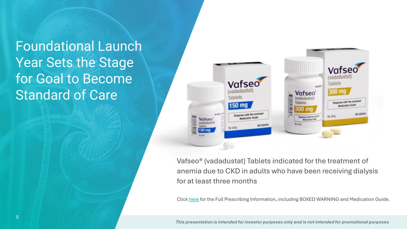 Commercial products fuel R&D growth engine Proven Success in Kidney Drug Development and Commercialization Growing Pipeline Driving Milestone-Rich 2026 and 2027 Oral phosphate binder used to treat hyperphosphatemia and anemia in patients with CKD Oral treatment for anemia due to chronic kidney disease (CKD) in dialysis launched in January 2025 Expanded patient access to approximately 275,000 patients at end of 2025 PHASE 2 (underway): Praliciguat: Soluble guanylate cyclase (sGC) stimulator targeting Focal Segmental Glomerulosclerosis (FSGS). Plan to assess in other rare podocytopathies. PHASE 2 (plan to start 2H 2026): AKB-097: Next-generation tissue-targeted complement inhibitor for multiple rare kidney disease indications with “pipeline in a product” potential PRECLINICAL/PHASE 1: Multiple hypoxia-inducible factor-prolyl hydroxylase (HIF-PH) inhibitor candidates in kidney and non-kidney indications 4 Net Product Revenues >$200M* *Over 12 months ended 9/30/25