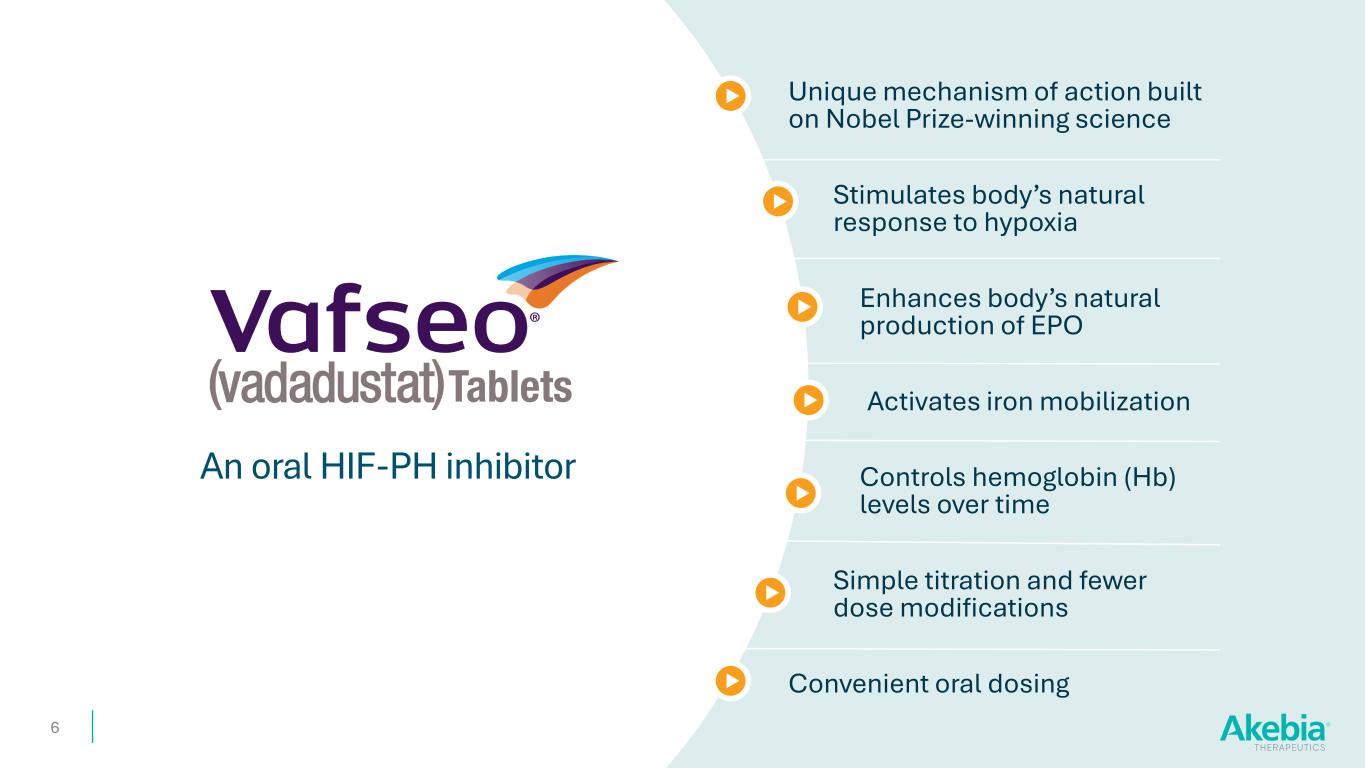 Vafseo® (vadadustat) Tablets indicated for the treatment of anemia due to CKD in adults who have been receiving dialysis for at least three months Click here for the Full Prescribing Information, including BOXED WARNING and Medication Guide. Foundational Launch Year Sets the Stage for Goal to Become Standard of Care 5 This presentation is intended for investor purposes only and is not intended for promotional purposes