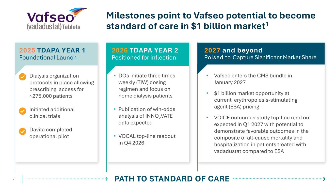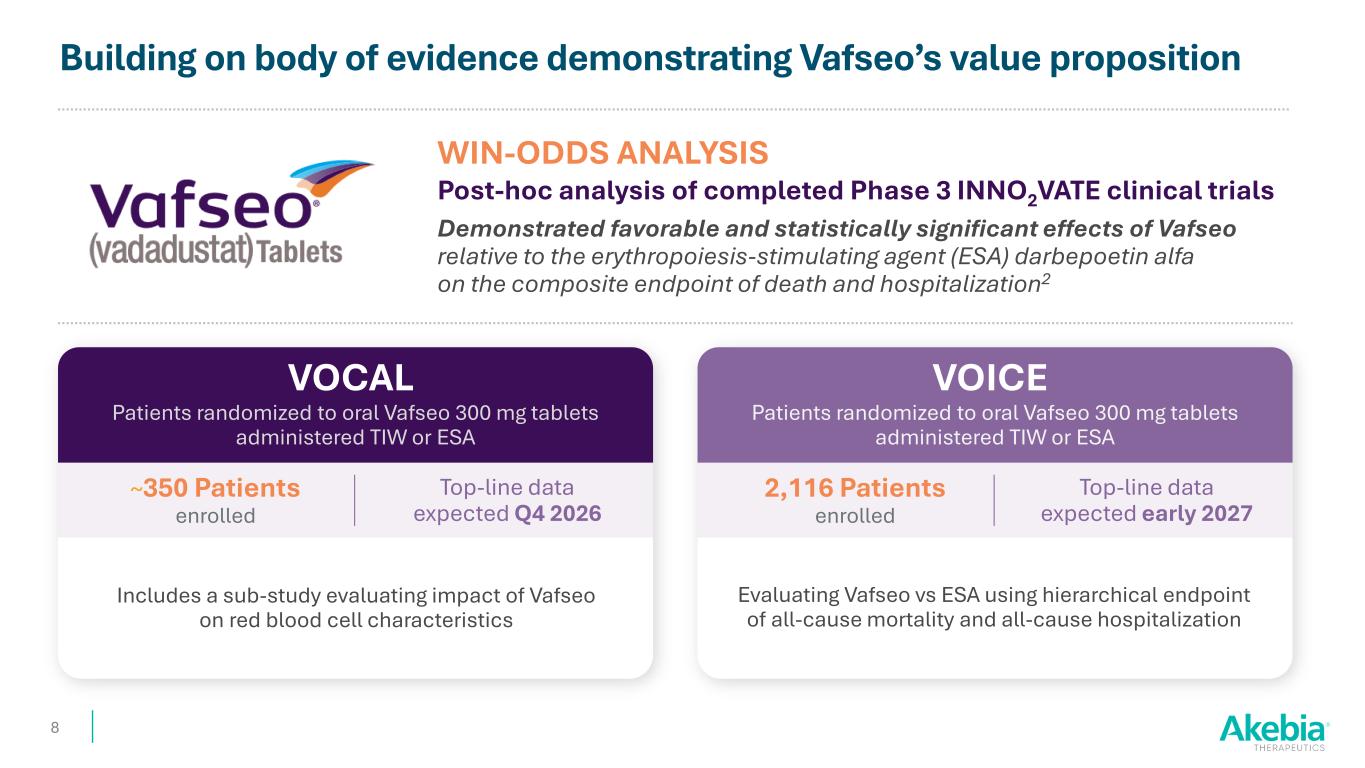 Building on body of evidence demonstrating Vafseo’s value proposition VOCAL 8 Patients randomized to oral Vafseo 300 mg tablets administered TIW or ESA WIN-ODDS ANALYSIS Post-hoc analysis of completed Phase 3 INNO2VATE clinical trials Demonstrated favorable and statistically significant effects of Vafseo relative to the erythropoiesis-stimulating agent (ESA) darbepoetin alfa on the composite endpoint of death and hospitalization2 Includes a sub-study evaluating impact of Vafseo on red blood cell characteristics ~350 Patients enrolled Top-line data expected Q4 2026 VOICE Patients randomized to oral Vafseo 300 mg tablets administered TIW or ESA Evaluating Vafseo vs ESA using hierarchical endpoint of all-cause mortality and all-cause hospitalization 2,116 Patients enrolled Top-line data expected early 2027