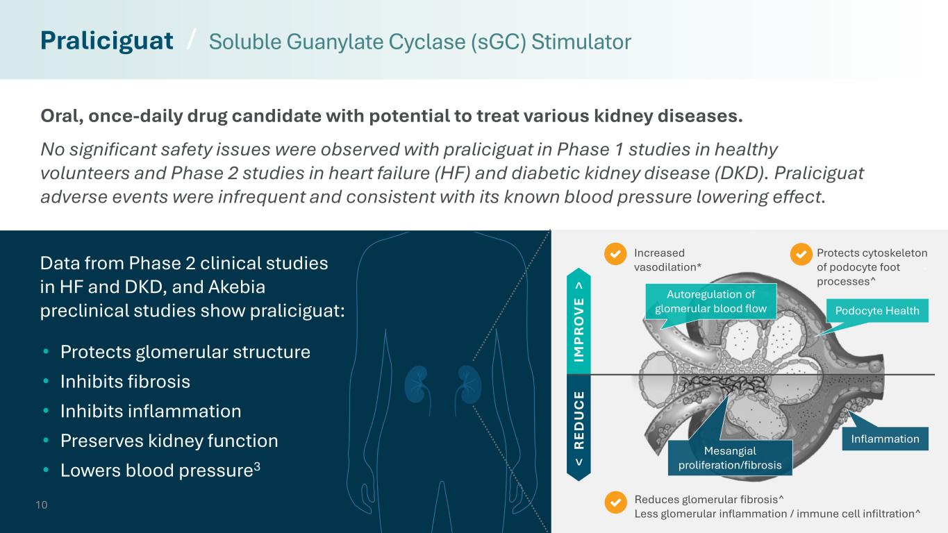 ASSET MECHANISM INDICATION Preclinical Phase I Phase 2 Phase 3 Kidney Praliciguat sGC Stimulator FSGS AKB-097 Anti-C3d-Factor H Fusion Protein Complement Inhibitor C3 Glomerulopathy (C3G) IgA Nephropathy (IgAN) Lupus Nephritis (LN) AKB-9090 HIF-PH Inhibitor Cardiac Surgery-Associated Acute Kidney Injury Other disease areas AKB-9090 HIF-PH Inhibitor ARDS AKB-10108 HIF-PH Inhibitor Retinopathy of Prematurity Robust mid- and early-stage pipeline in rare kidney disease and beyond 9