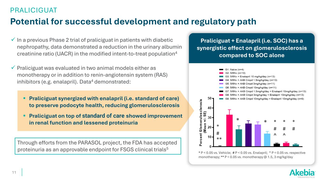 10 Reduces glomerular fibrosis^ Less glomerular inflammation / immune cell infiltration^ Protects cytoskeleton of podocyte foot processes^ Increased vasodilation* Oral, once-daily drug candidate with potential to treat various kidney diseases. No significant safety issues were observed with praliciguat in Phase 1 studies in healthy volunteers and Phase 2 studies in heart failure (HF) and diabetic kidney disease (DKD). Praliciguat adverse events were infrequent and consistent with its known blood pressure lowering effect. Praliciguat / Soluble Guanylate Cyclase (sGC) Stimulator < R ED U C E IM P R O V E > Inflammation Mesangial proliferation/fibrosis • Protects glomerular structure • Inhibits fibrosis • Inhibits inflammation • Preserves kidney function • Lowers blood pressure3 Autoregulation of glomerular blood flow Podocyte Health Data from Phase 2 clinical studies in HF and DKD, and Akebia preclinical studies show praliciguat: