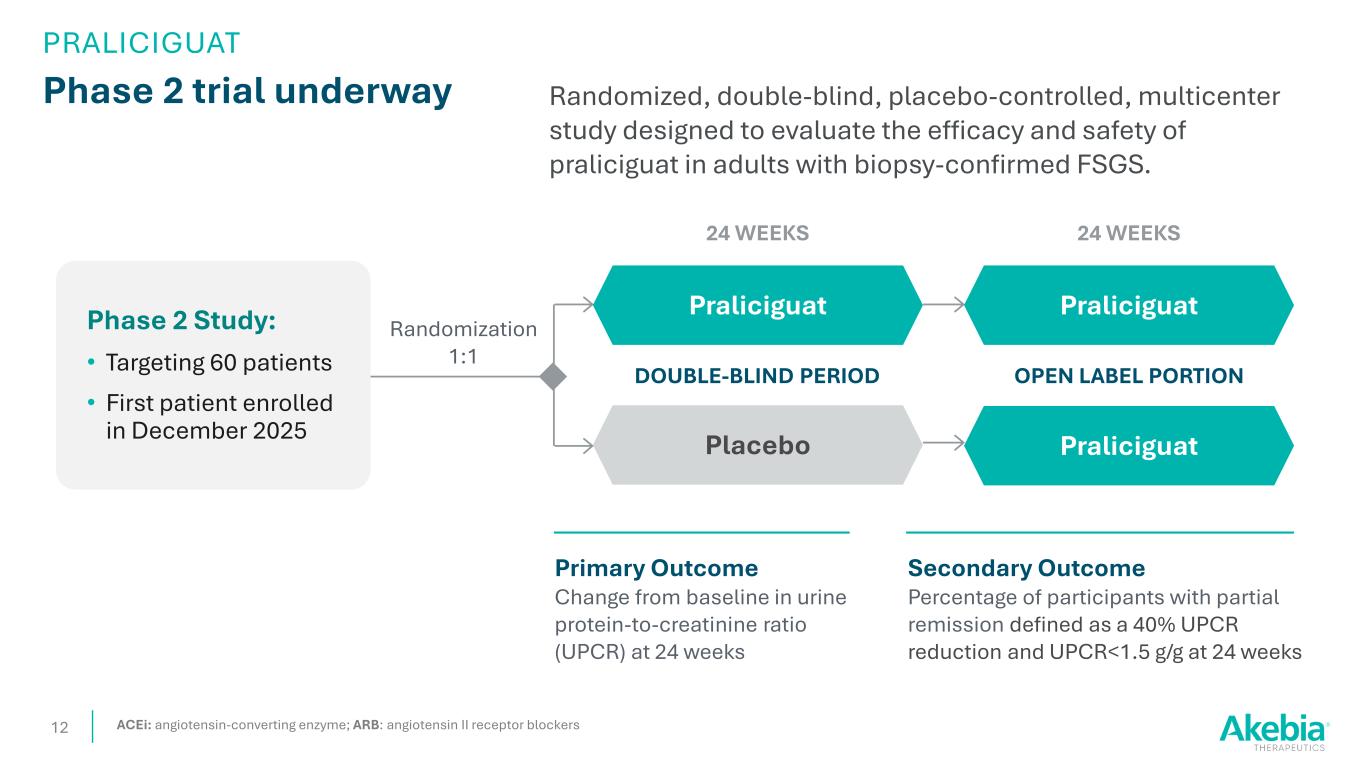  In a previous Phase 2 trial of praliciguat in patients with diabetic nephropathy, data demonstrated a reduction in the urinary albumin creatinine ratio (UACR) in the modified intent-to-treat population4  Praliciguat was evaluated in two animal models either as monotherapy or in addition to renin-angiotensin system (RAS) inhibitors (e.g. enalapril). Data4 demonstrated:  Praliciguat synergized with enalapril (i.e. standard of care) to preserve podocyte health, reducing glomerulosclerosis  Praliciguat on top of standard of care showed improvement in renal function and lessened proteinuria Praliciguat + Enalapril (i.e. SOC) has a synergistic effect on glomerulosclerosis compared to SOC alone Potential for successful development and regulatory path 11 * P < 0.05 vs. Vehicle; # P < 0.05 vs. Enalapril; ^ P < 0.05 vs. respective monotherapy; ** P < 0.05 vs. monotherapy @ 1.5, 3 mg/kg/day Through efforts from the PARASOL project, the FDA has accepted proteinuria as an approvable endpoint for FSGS clinical trials5 PRALICIGUAT