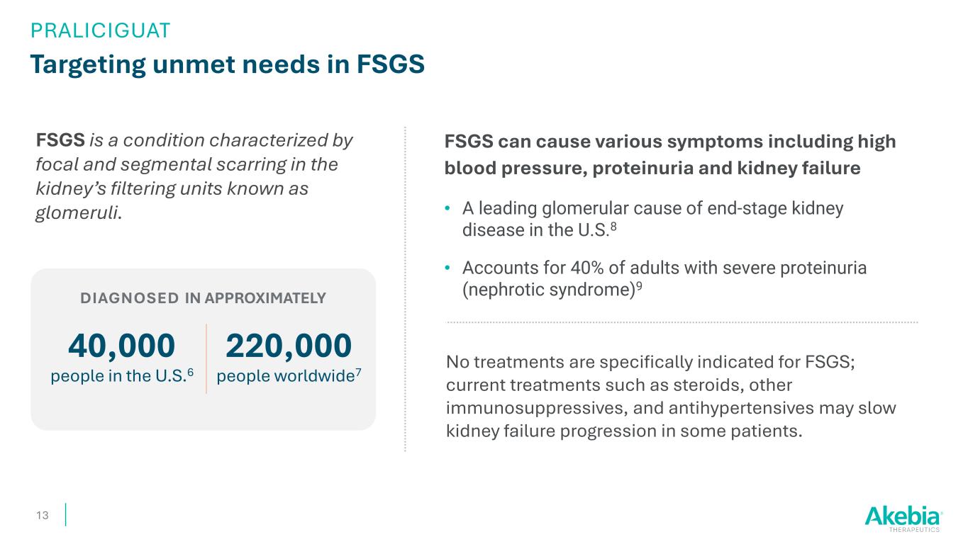 Phase 2 trial underway 12 Randomized, double-blind, placebo-controlled, multicenter study designed to evaluate the efficacy and safety of praliciguat in adults with biopsy-confirmed FSGS. Randomization 1:1 Placebo Praliciguat Secondary Outcome Percentage of participants with partial remission defined as a 40% UPCR reduction and UPCR<1.5 g/g at 24 weeks DOUBLE-BLIND PERIOD Primary Outcome Change from baseline in urine protein-to-creatinine ratio (UPCR) at 24 weeks 24 WEEKS OPEN LABEL PORTION Praliciguat Praliciguat 24 WEEKS ACEi: angiotensin-converting enzyme; ARB: angiotensin II receptor blockers PRALICIGUAT Phase 2 Study: • Targeting 60 patients • First patient enrolled in December 2025