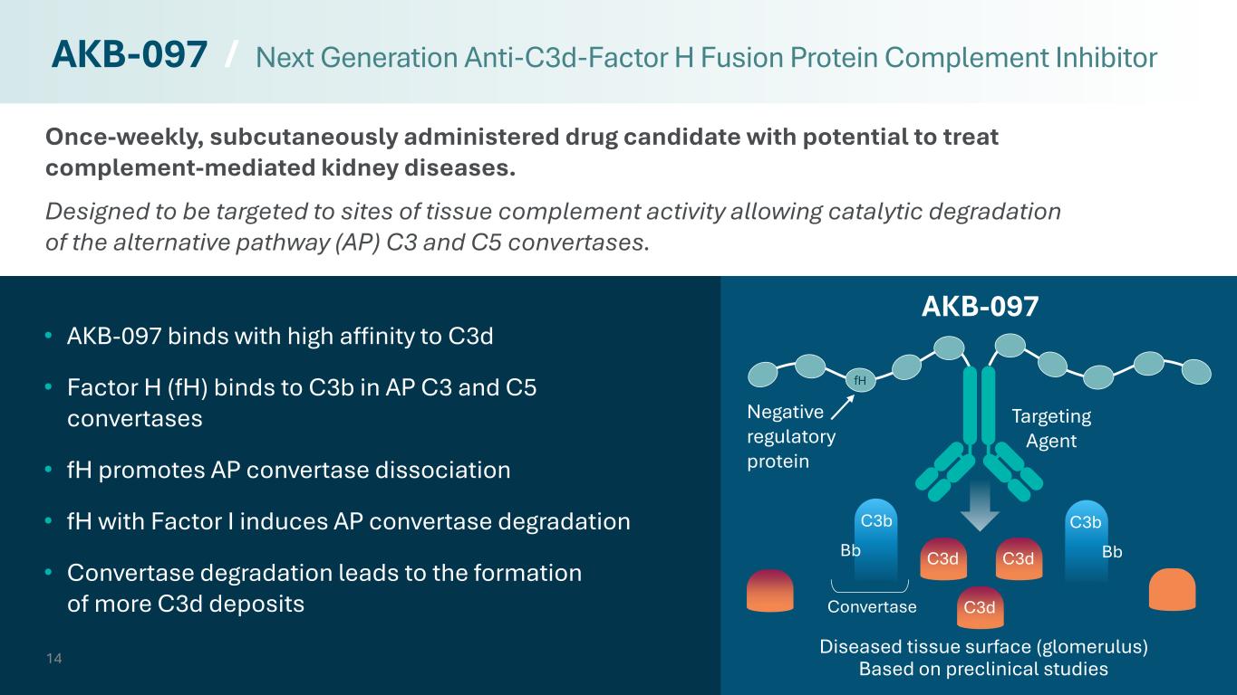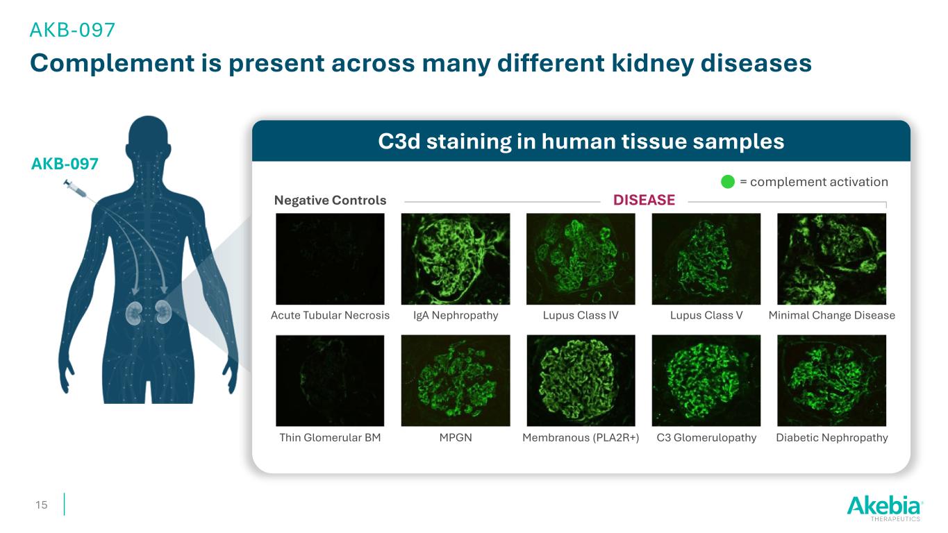 Once-weekly, subcutaneously administered drug candidate with potential to treat complement-mediated kidney diseases. Designed to be targeted to sites of tissue complement activity allowing catalytic degradation of the alternative pathway (AP) C3 and C5 convertases. 14 • AKB-097 binds with high affinity to C3d • Factor H (fH) binds to C3b in AP C3 and C5 convertases • fH promotes AP convertase dissociation • fH with Factor I induces AP convertase degradation • Convertase degradation leads to the formation of more C3d deposits AKB-097 / Next Generation Anti-C3d-Factor H Fusion Protein Complement Inhibitor C3b Bb C3b Bb Convertase C3d C3d C3d Targeting Agent Negative regulatory protein AKB-097 Diseased tissue surface (glomerulus) Based on preclinical studies fH