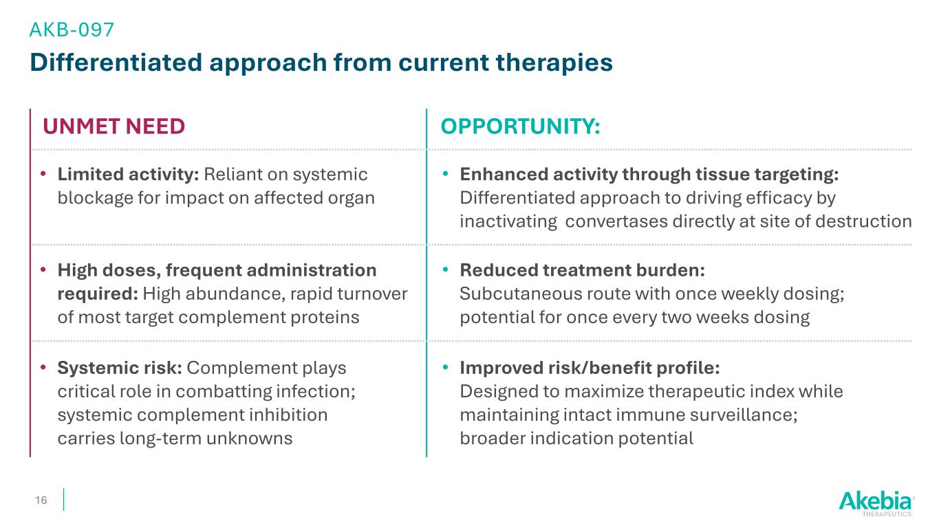 Complement is present across many different kidney diseases 15 AKB-097 C3d staining in human tissue samples DISEASENegative Controls Acute Tubular Necrosis Thin Glomerular BM MPGN Membranous (PLA2R+) C3 Glomerulopathy Diabetic Nephropathy Minimal Change DiseaseLupus Class VLupus Class IVIgA Nephropathy = complement activation AKB-097