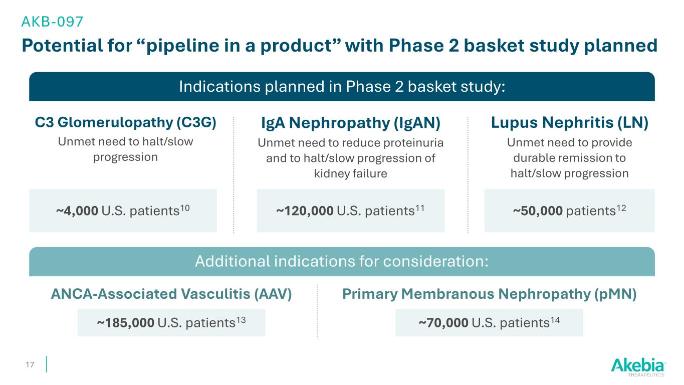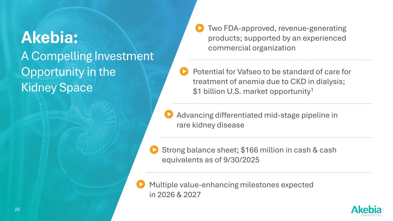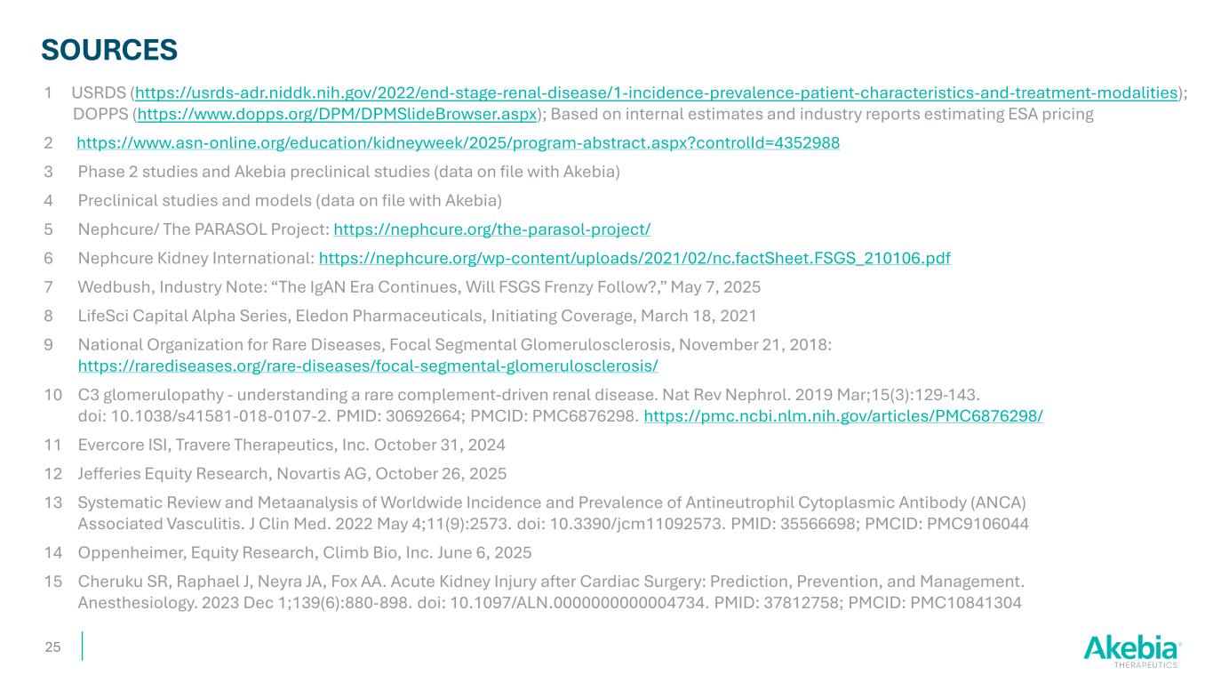 SOURCES 25 1 USRDS (https://usrds-adr.niddk.nih.gov/2022/end-stage-renal-disease/1-incidence-prevalence-patient-characteristics-and-treatment-modalities); DOPPS (https://www.dopps.org/DPM/DPMSlideBrowser.aspx); Based on internal estimates and industry reports estimating ESA pricing 2 https://www.asn-online.org/education/kidneyweek/2025/program-abstract.aspx?controlId=4352988 3 Phase 2 studies and Akebia preclinical studies (data on file with Akebia) 4 Preclinical studies and models (data on file with Akebia) 5 Nephcure/ The PARASOL Project: https://nephcure.org/the-parasol-project/ 6 Nephcure Kidney International: https://nephcure.org/wp-content/uploads/2021/02/nc.factSheet.FSGS_210106.pdf 7 Wedbush, Industry Note: “The IgAN Era Continues, Will FSGS Frenzy Follow?,” May 7, 2025 8 LifeSci Capital Alpha Series, Eledon Pharmaceuticals, Initiating Coverage, March 18, 2021 9 National Organization for Rare Diseases, Focal Segmental Glomerulosclerosis, November 21, 2018: https://rarediseases.org/rare-diseases/focal-segmental-glomerulosclerosis/ 10 C3 glomerulopathy - understanding a rare complement-driven renal disease. Nat Rev Nephrol. 2019 Mar;15(3):129-143. doi: 10.1038/s41581-018-0107-2. PMID: 30692664; PMCID: PMC6876298. https://pmc.ncbi.nlm.nih.gov/articles/PMC6876298/ 11 Evercore ISI, Travere Therapeutics, Inc. October 31, 2024 12 Jefferies Equity Research, Novartis AG, October 26, 2025 13 Systematic Review and Metaanalysis of Worldwide Incidence and Prevalence of Antineutrophil Cytoplasmic Antibody (ANCA) Associated Vasculitis. J Clin Med. 2022 May 4;11(9):2573. doi: 10.3390/jcm11092573. PMID: 35566698; PMCID: PMC9106044 14 Oppenheimer, Equity Research, Climb Bio, Inc. June 6, 2025 15 Cheruku SR, Raphael J, Neyra JA, Fox AA. Acute Kidney Injury after Cardiac Surgery: Prediction, Prevention, and Management. Anesthesiology. 2023 Dec 1;139(6):880-898. doi: 10.1097/ALN.0000000000004734. PMID: 37812758; PMCID: PMC10841304