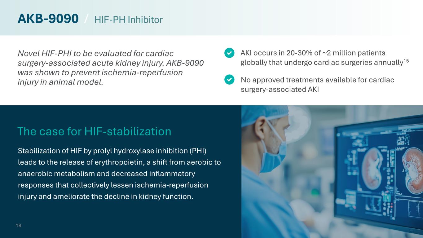 Novel HIF-PHI to be evaluated for cardiac surgery-associated acute kidney injury. AKB-9090 was shown to prevent ischemia-reperfusion injury in animal model. Stabilization of HIF by prolyl hydroxylase inhibition (PHI) leads to the release of erythropoietin, a shift from aerobic to anaerobic metabolism and decreased inflammatory responses that collectively lessen ischemia-reperfusion injury and ameliorate the decline in kidney function. No approved treatments available for cardiac surgery-associated AKI AKI occurs in 20-30% of ~2 million patients globally that undergo cardiac surgeries annually15 The case for HIF-stabilization 18 AKB-9090 / HIF-PH Inhibitor