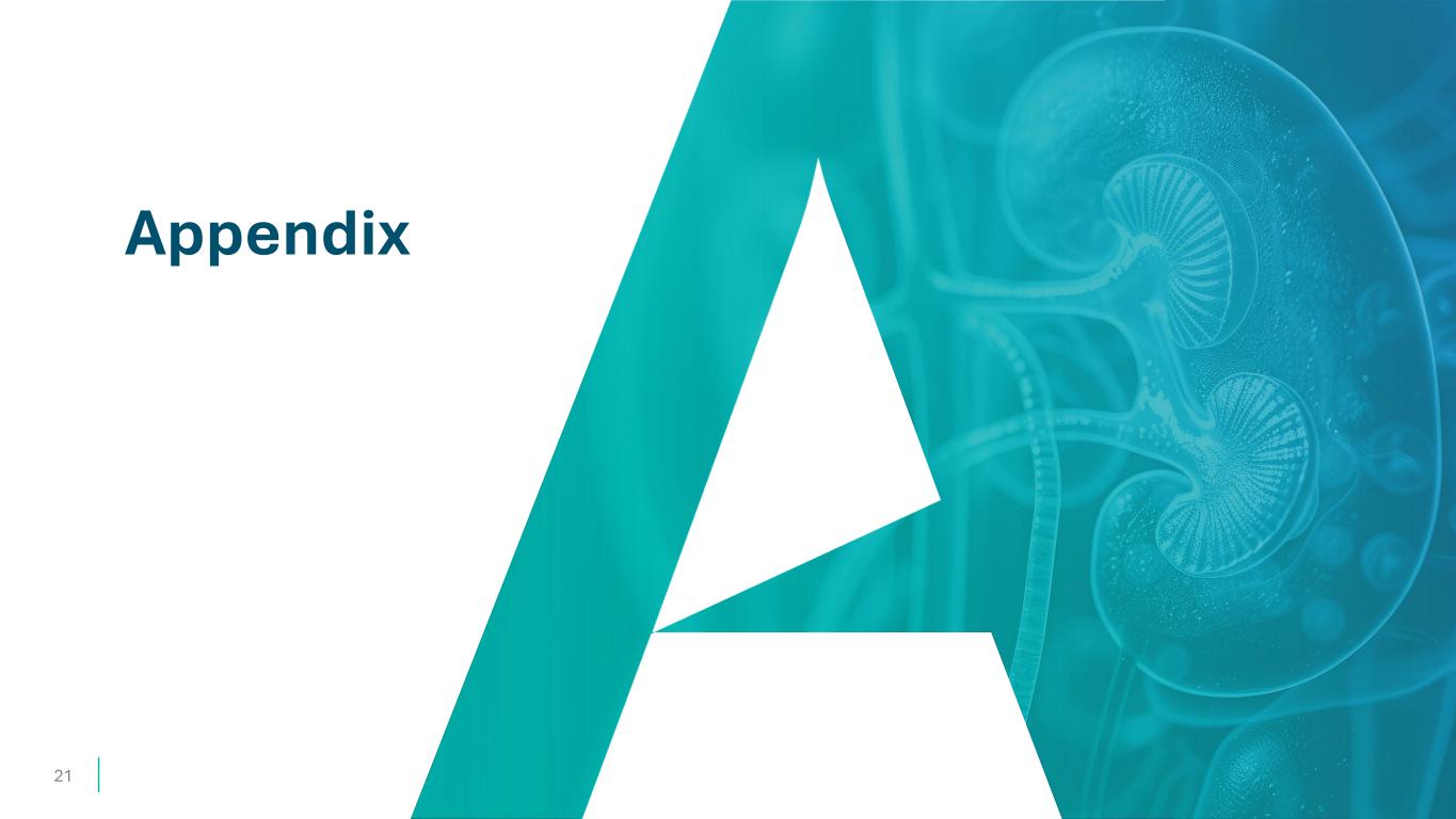 Akebia: A Compelling Investment Opportunity in the Kidney Space 20 • Two FDA-approved, revenue-generating products; supported by an experienced commercial organization • Potential for Vafseo to be standard of care for treatment of anemia due to CKD in dialysis; $1 billion U.S. market opportunity1 • Advancing differentiated mid-stage pipeline in rare kidney disease • Strong balance sheet; $166 million in cash & cash equivalents as of 9/30/2025 • Multiple value-enhancing milestones expected in 2026 & 2027