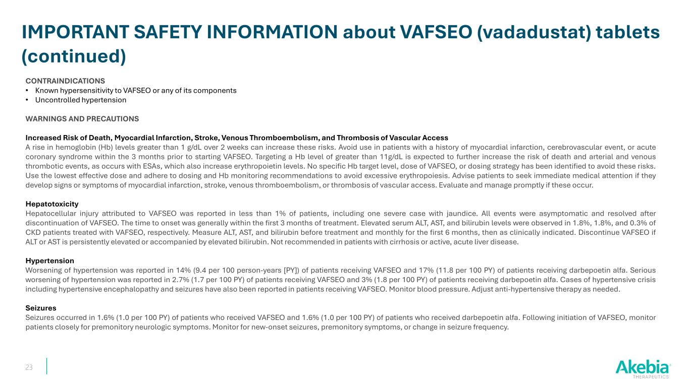 CONTRAINDICATIONS • Known hypersensitivity to VAFSEO or any of its components • Uncontrolled hypertension WARNINGS AND PRECAUTIONS Increased Risk of Death, Myocardial Infarction, Stroke, Venous Thromboembolism, and Thrombosis of Vascular Access A rise in hemoglobin (Hb) levels greater than 1 g/dL over 2 weeks can increase these risks. Avoid use in patients with a history of myocardial infarction, cerebrovascular event, or acute coronary syndrome within the 3 months prior to starting VAFSEO. Targeting a Hb level of greater than 11g/dL is expected to further increase the risk of death and arterial and venous thrombotic events, as occurs with ESAs, which also increase erythropoietin levels. No specific Hb target level, dose of VAFSEO, or dosing strategy has been identified to avoid these risks. Use the lowest effective dose and adhere to dosing and Hb monitoring recommendations to avoid excessive erythropoiesis. Advise patients to seek immediate medical attention if they develop signs or symptoms of myocardial infarction, stroke, venous thromboembolism, or thrombosis of vascular access. Evaluate and manage promptly if these occur. Hepatotoxicity Hepatocellular injury attributed to VAFSEO was reported in less than 1% of patients, including one severe case with jaundice. All events were asymptomatic and resolved after discontinuation of VAFSEO. The time to onset was generally within the first 3 months of treatment. Elevated serum ALT, AST, and bilirubin levels were observed in 1.8%, 1.8%, and 0.3% of CKD patients treated with VAFSEO, respectively. Measure ALT, AST, and bilirubin before treatment and monthly for the first 6 months, then as clinically indicated. Discontinue VAFSEO if ALT or AST is persistently elevated or accompanied by elevated bilirubin. Not recommended in patients with cirrhosis or active, acute liver disease. Hypertension Worsening of hypertension was reported in 14% (9.4 per 100 person-years [PY]) of patients receiving VAFSEO and 17% (11.8 per 100 PY) of patients receiving darbepoetin alfa. Serious worsening of hypertension was reported in 2.7% (1.7 per 100 PY) of patients receiving VAFSEO and 3% (1.8 per 100 PY) of patients receiving darbepoetin alfa. Cases of hypertensive crisis including hypertensive encephalopathy and seizures have also been reported in patients receiving VAFSEO. Monitor blood pressure. Adjust anti-hypertensive therapy as needed. Seizures Seizures occurred in 1.6% (1.0 per 100 PY) of patients who received VAFSEO and 1.6% (1.0 per 100 PY) of patients who received darbepoetin alfa. Following initiation of VAFSEO, monitor patients closely for premonitory neurologic symptoms. Monitor for new-onset seizures, premonitory symptoms, or change in seizure frequency. IMPORTANT SAFETY INFORMATION about VAFSEO (vadadustat) tablets (continued) 23
