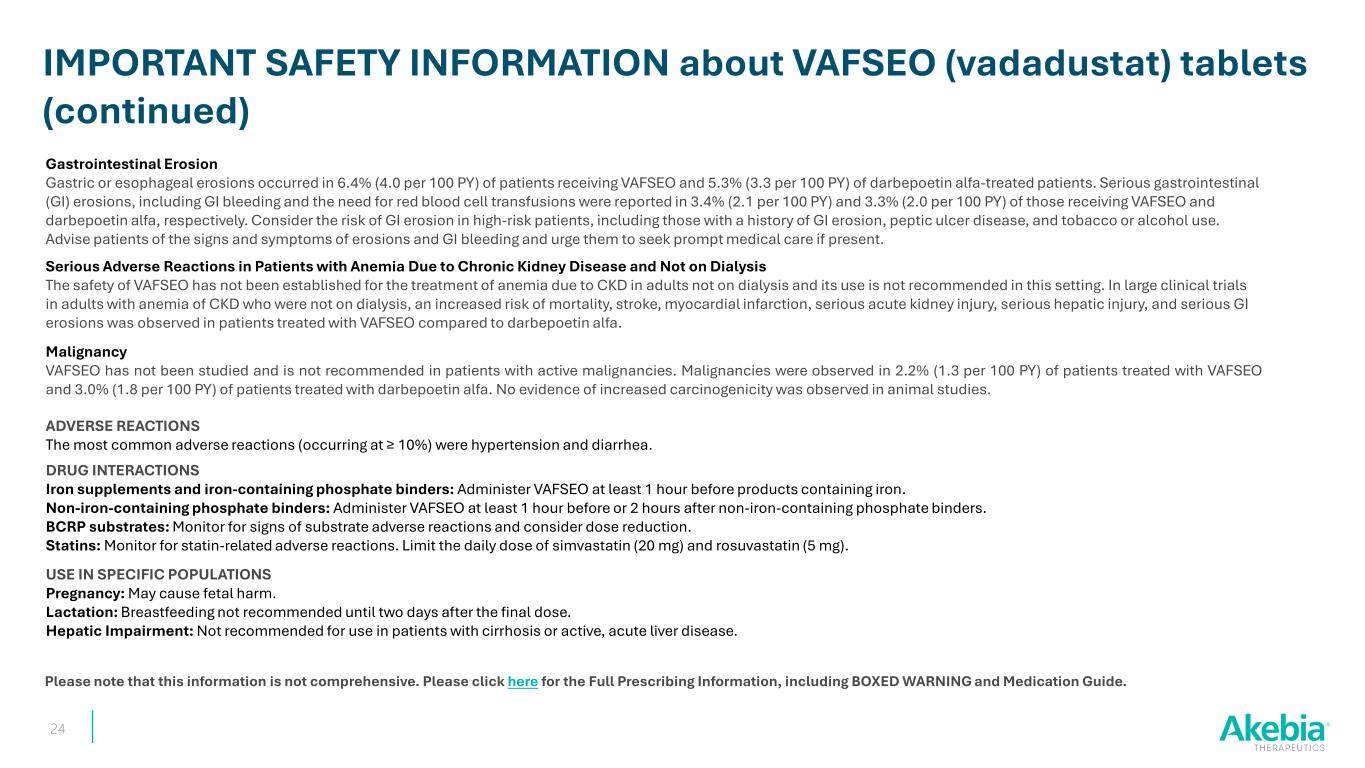 IMPORTANT SAFETY INFORMATION about VAFSEO (vadadustat) tablets (continued) 24 Gastrointestinal Erosion Gastric or esophageal erosions occurred in 6.4% (4.0 per 100 PY) of patients receiving VAFSEO and 5.3% (3.3 per 100 PY) of darbepoetin alfa-treated patients. Serious gastrointestinal (GI) erosions, including GI bleeding and the need for red blood cell transfusions were reported in 3.4% (2.1 per 100 PY) and 3.3% (2.0 per 100 PY) of those receiving VAFSEO and darbepoetin alfa, respectively. Consider the risk of GI erosion in high-risk patients, including those with a history of GI erosion, peptic ulcer disease, and tobacco or alcohol use. Advise patients of the signs and symptoms of erosions and GI bleeding and urge them to seek prompt medical care if present. Serious Adverse Reactions in Patients with Anemia Due to Chronic Kidney Disease and Not on Dialysis The safety of VAFSEO has not been established for the treatment of anemia due to CKD in adults not on dialysis and its use is not recommended in this setting. In large clinical trials in adults with anemia of CKD who were not on dialysis, an increased risk of mortality, stroke, myocardial infarction, serious acute kidney injury, serious hepatic injury, and serious GI erosions was observed in patients treated with VAFSEO compared to darbepoetin alfa. Malignancy VAFSEO has not been studied and is not recommended in patients with active malignancies. Malignancies were observed in 2.2% (1.3 per 100 PY) of patients treated with VAFSEO and 3.0% (1.8 per 100 PY) of patients treated with darbepoetin alfa. No evidence of increased carcinogenicity was observed in animal studies. ADVERSE REACTIONS The most common adverse reactions (occurring at ≥ 10%) were hypertension and diarrhea. DRUG INTERACTIONS Iron supplements and iron-containing phosphate binders: Administer VAFSEO at least 1 hour before products containing iron. Non-iron-containing phosphate binders: Administer VAFSEO at least 1 hour before or 2 hours after non-iron-containing phosphate binders. BCRP substrates: Monitor for signs of substrate adverse reactions and consider dose reduction. Statins: Monitor for statin-related adverse reactions. Limit the daily dose of simvastatin (20 mg) and rosuvastatin (5 mg). USE IN SPECIFIC POPULATIONS Pregnancy: May cause fetal harm. Lactation: Breastfeeding not recommended until two days after the final dose. Hepatic Impairment: Not recommended for use in patients with cirrhosis or active, acute liver disease. Please note that this information is not comprehensive. Please click here for the Full Prescribing Information, including BOXED WARNING and Medication Guide.