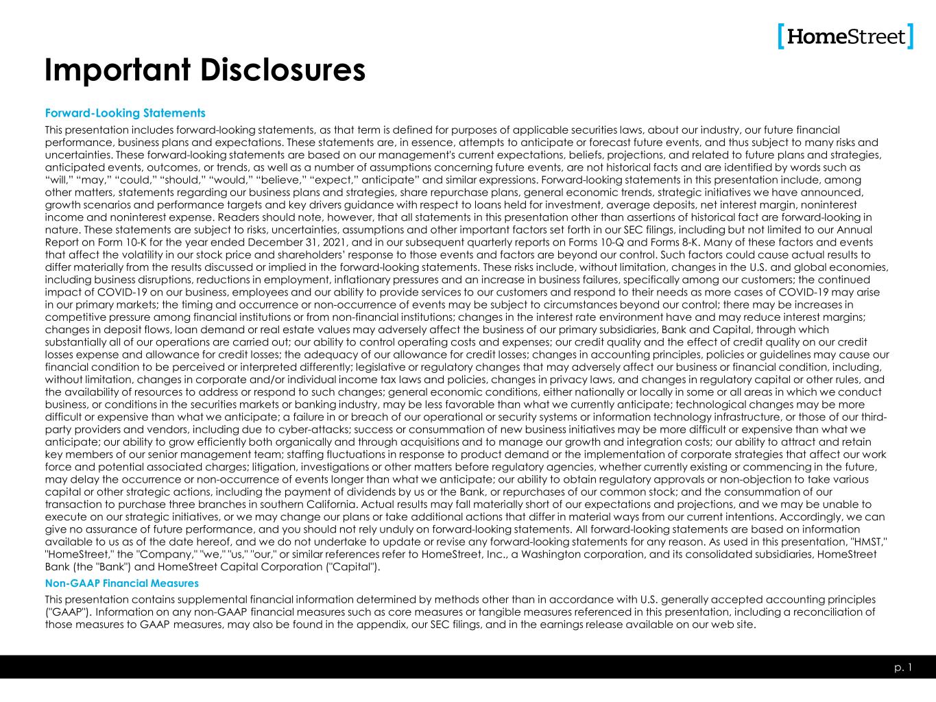 Important Disclosures Forward-Looking Statements This presentation includes forward-looking statements, as that term is defined for purposes of applicable securities laws, about our industry, our future financial performance, business plans and expectations. These statements are, in essence, attempts to anticipate or forecast future events, and thus subject to many risks and uncertainties. These forward-looking statements are based on our management's current expectations, beliefs, projections, and related to future plans and strategies, anticipated events, outcomes, or trends, as well as a number of assumptions concerning future events, are not historical facts and are identified by words such as “will,” “may,” “could,” “should,” “would,” “believe,” “expect,” anticipate” and similar expressions. Forward-looking statements in this presentation include, among other matters, statements regarding our business plans and strategies, share repurchase plans, general economic trends, strategic initiatives we have announced, growth scenarios and performance targets and key drivers guidance with respect to loans held for investment, average deposits, net interest margin, noninterest income and noninterest expense. Readers should note, however, that all statements in this presentation other than assertions of historical fact are forward-looking in nature. These statements are subject to risks, uncertainties, assumptions and other important factors set forth in our SEC filings, including but not limited to our Annual Report on Form 10-K for the year ended December 31, 2021, and in our subsequent quarterly reports on Forms 10-Q and Forms 8-K. Many of these factors and events that affect the volatility in our stock price and shareholders’ response to those events and factors are beyond our control. Such factors could cause actual results to differ materially from the results discussed or implied in the forward-looking statements. These risks include, without limitation, changes in the U.S. and global economies, including business disruptions, reductions in employment, inflationary pressures and an increase in business failures, specifically among our customers; the continued impact of COVID-19 on our business, employees and our ability to provide services to our customers and respond to their needs as more cases of COVID-19 may arise in our primary markets; the timing and occurrence or non-occurrence of events may be subject to circumstances beyond our control; there may be increases in competitive pressure among financial institutions or from non-financial institutions; changes in the interest rate environment have and may reduce interest margins; changes in deposit flows, loan demand or real estate values may adversely affect the business of our primary subsidiaries, Bank and Capital, through which substantially all of our operations are carried out; our ability to control operating costs and expenses; our credit quality and the effect of credit quality on our credit losses expense and allowance for credit losses; the adequacy of our allowance for credit losses; changes in accounting principles, policies or guidelines may cause our financial condition to be perceived or interpreted differently; legislative or regulatory changes that may adversely affect our business or financial condition, including, without limitation, changes in corporate and/or individual income tax laws and policies, changes in privacy laws, and changes in regulatory capital or other rules, and the availability of resources to address or respond to such changes; general economic conditions, either nationally or locally in some or all areas in which we conduct business, or conditions in the securities markets or banking industry, may be less favorable than what we currently anticipate; technological changes may be more difficult or expensive than what we anticipate; a failure in or breach of our operational or security systems or information technology infrastructure, or those of our third- party providers and vendors, including due to cyber-attacks; success or consummation of new business initiatives may be more difficult or expensive than what we anticipate; our ability to grow efficiently both organically and through acquisitions and to manage our growth and integration costs; our ability to attract and retain key members of our senior management team; staffing fluctuations in response to product demand or the implementation of corporate strategies that affect our work force and potential associated charges; litigation, investigations or other matters before regulatory agencies, whether currently existing or commencing in the future, may delay the occurrence or non-occurrence of events longer than what we anticipate; our ability to obtain regulatory approvals or non-objection to take various capital or other strategic actions, including the payment of dividends by us or the Bank, or repurchases of our common stock; and the consummation of our transaction to purchase three branches in southern California. Actual results may fall materially short of our expectations and projections, and we may be unable to execute on our strategic initiatives, or we may change our plans or take additional actions that differ in material ways from our current intentions. Accordingly, we can give no assurance of future performance, and you should not rely unduly on forward-looking statements. All forward-looking statements are based on information available to us as of the date hereof, and we do not undertake to update or revise any forward-looking statements for any reason. As used in this presentation, "HMST," "HomeStreet," the "Company," "we," "us," "our," or similar references refer to HomeStreet, Inc., a Washington corporation, and its consolidated subsidiaries, HomeStreet Bank (the "Bank") and HomeStreet Capital Corporation ("Capital"). Non-GAAP Financial Measures This presentation contains supplemental financ