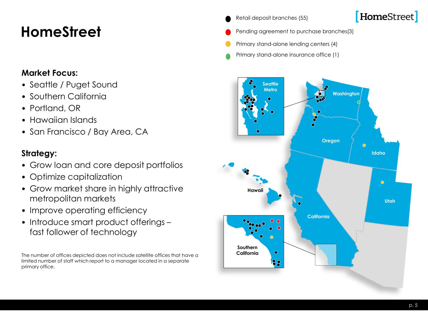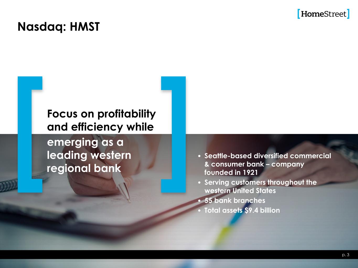 p. 3 Focus on profitability and efficiency while emerging as a leading western regional bank • Seattle-based diversified commercial & consumer bank – company founded in 1921 • Serving customers throughout the western United States • 55 bank branches • Total assets $9.4 billion Nasdaq: HMST