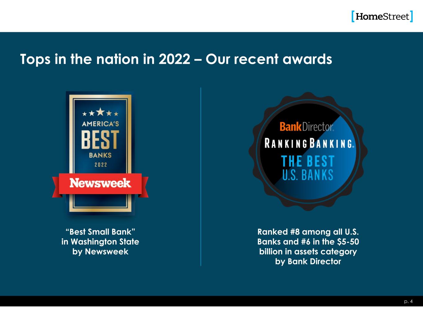 Tops in the nation in 2022 – Our recent awards p. 4 “Best Small Bank” in Washington State by Newsweek Ranked #8 among all U.S. Banks and #6 in the $5-50 billion in assets category by Bank Director