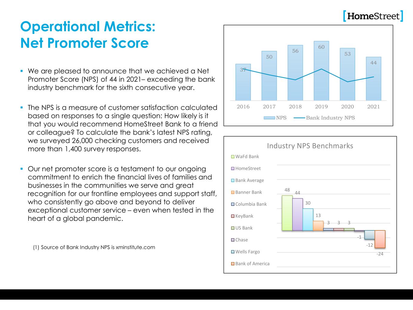 The content Operational Metrics: Net Promoter Score  We are pleased to announce that we achieved a Net Promoter Score (NPS) of 44 in 2021– exceeding the bank industry benchmark for the sixth consecutive year.  The NPS is a measure of customer satisfaction calculated based on responses to a single question: How likely is it that you would recommend HomeStreet Bank to a friend or colleague? To calculate the bank’s latest NPS rating, we surveyed 26,000 checking customers and received more than 1,400 survey responses.  Our net promoter score is a testament to our ongoing commitment to enrich the financial lives of families and businesses in the communities we serve and great recognition for our frontline employees and support staff, who consistently go above and beyond to deliver exceptional customer service – even when tested in the heart of a global pandemic. (1) Source of Bank Industry NPS is xminstitute.com 37 50 56 60 53 44 2016 2017 2018 2019 2020 2021 NPS Bank Industry NPS 48 44 30 13 3 3 3 -1 -12 -24 Industry NPS Benchmarks WaFd Bank HomeStreet Bank Average Banner Bank Columbia Bank KeyBank US Bank Chase Wells Fargo Bank of America
