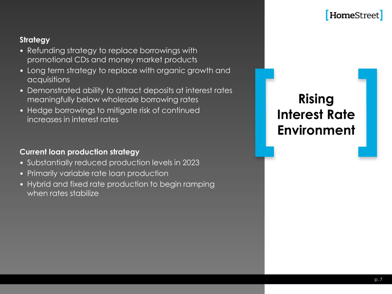 p. 7 Strategy • Refunding strategy to replace borrowings with promotional CDs and money market products • Long term strategy to replace with organic growth and acquisitions • Demonstrated ability to attract deposits at interest rates meaningfully below wholesale borrowing rates • Hedge borrowings to mitigate risk of continued increases in interest rates Current loan production strategy • Substantially reduced production levels in 2023 • Primarily variable rate loan production • Hybrid and fixed rate production to begin ramping when rates stabilize Rising Interest Rate Environment