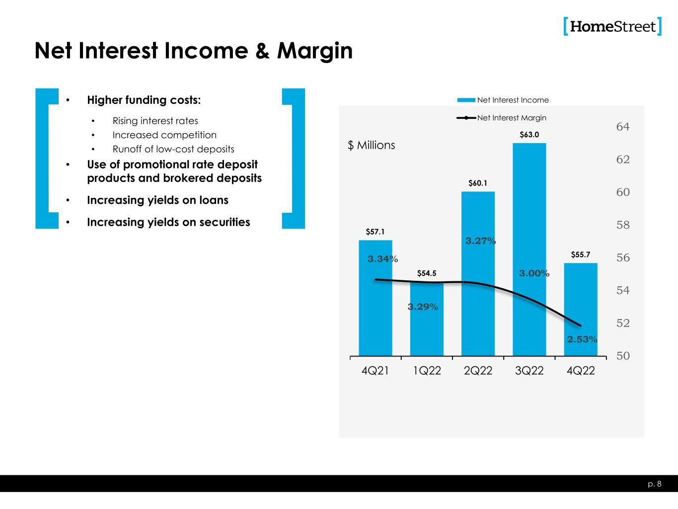 Highlights and Developments p. 2 Quarterly Results • Net income of $8.5 million, or $0.45 per share • ROAE of 6.0%, ROATE of 6.4%(1) and ROAA of 0.36% • Efficiency ratio of 76.2%(1) • Net interest margin of 2.53% • Net interest income decreased by 12% in the quarter • Loans held for investment increased by $209 million or 3% in the quarter • Yield on loans 4.32% during 2022 fourth quarter • Cost of deposits of 1.61% on December 31, 2022 • Total deposits increased by $842 million • Provision for credit losses of $3.8 million • Nonperforming assets to total assets 0.13% • Book value per share of $30.01 and tangible book value per share of $28.41(1) on December 31, 2022 Other Results • Declared and paid a quarterly cash dividend of $0.35 per share Recent Developments • Purchase of approximately $450 million in deposits and three retail branches in southern California is scheduled to close in the first quarter of 2023 HomeStreet’s results reflect the challenges of rising interest rates, market competition for interest rate sensitive deposits and seasonally low lending activity (1) See appendix for reconciliation of non-GAAP financial measures.