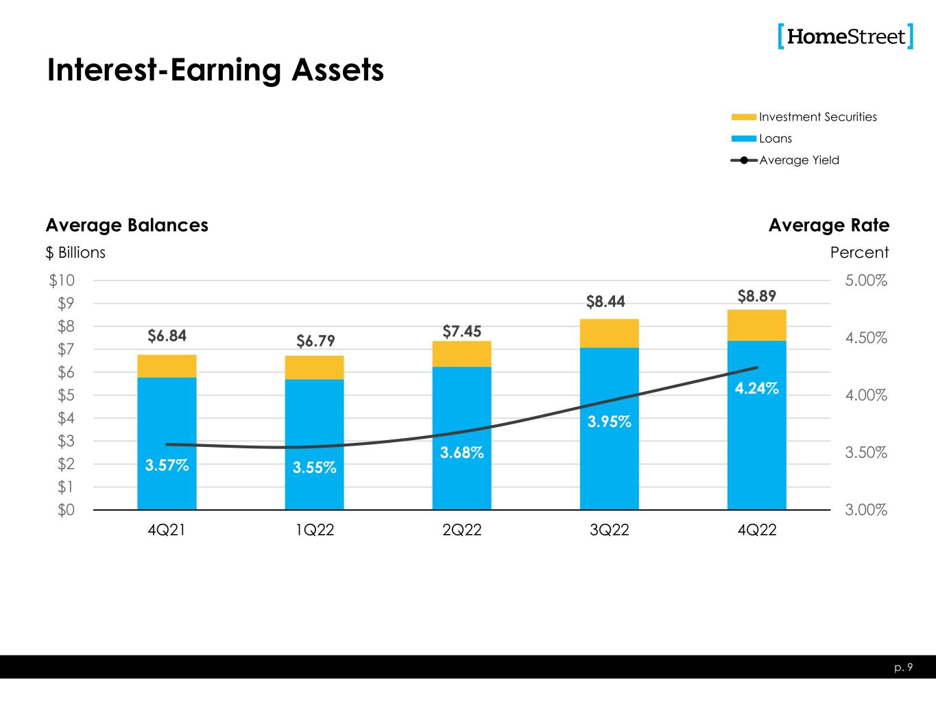 $57.1 $54.5 $60.1 $63.0 $55.73.34% 3.29% 3.27% 3.00% 2.53% 50 52 54 56 58 60 62 64 4Q21 1Q22 2Q22 3Q22 4Q22 Net Interest Income Net Interest Margin Net Interest Income & Margin p. 8 $ Millions • Higher funding costs: • Rising interest rates • Increased competition • Runoff of low-cost deposits • Use of promotional rate deposit products and brokered deposits • Increasing yields on loans • Increasing yields on securities