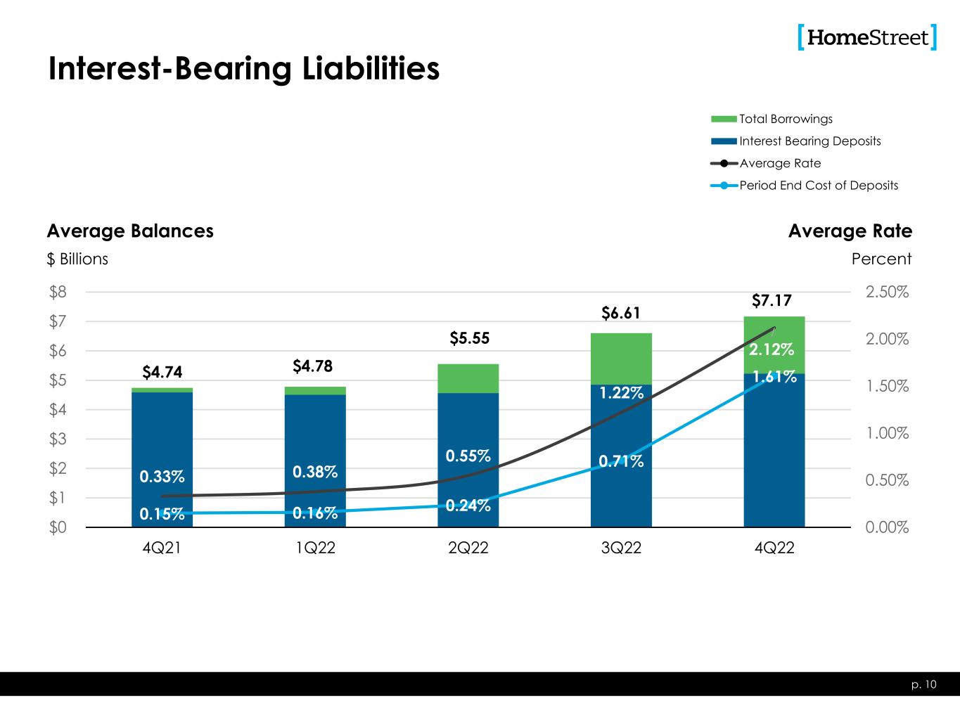 $6.84 $6.79 $7.45 $8.44 $8.89 3.57% 3.55% 3.68% 3.95% 4.24% 3.00% 3.50% 4.00% 4.50% 5.00% $0 $1 $2 $3 $4 $5 $6 $7 $8 $9 $10 4Q21 1Q22 2Q22 3Q22 4Q22 Investment Securities Loans Average Yield Interest-Earning Assets p. 9 Average Balances $ Billions Average Rate Percent