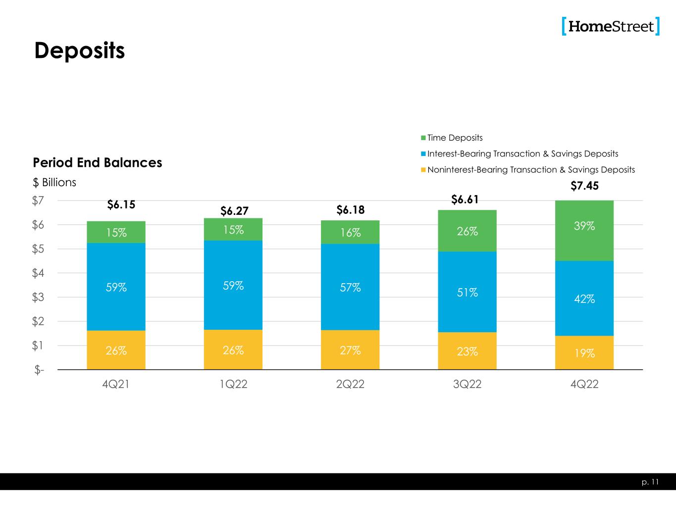 $4.74 $4.78 $5.55 $6.61 $7.17 0.33% 0.38% 0.55% 1.22% 2.12% 0.15% 0.16% 0.24% 0.71% 1.61% 0.00% 0.50% 1.00% 1.50% 2.00% 2.50% $0 $1 $2 $3 $4 $5 $6 $7 $8 4Q21 1Q22 2Q22 3Q22 4Q22 Total Borrowings Interest Bearing Deposits Average Rate Period End Cost of Deposits Interest-Bearing Liabilities Average Balances p. 10 $ Billions Average Rate Percent