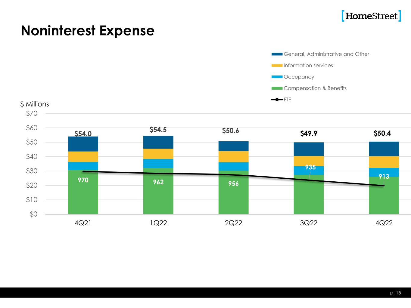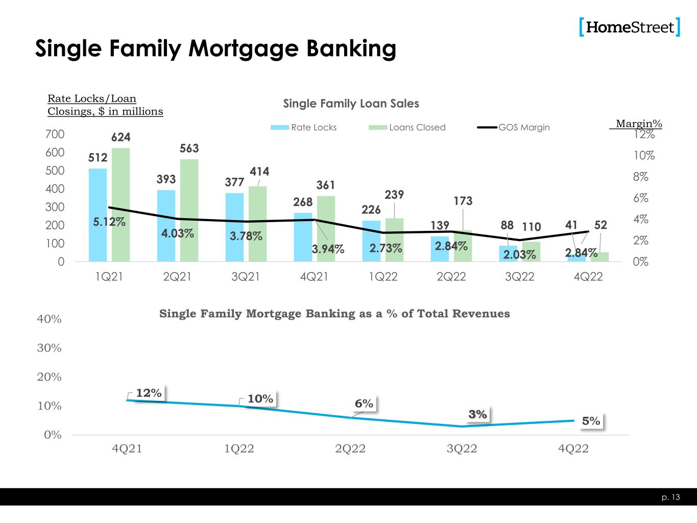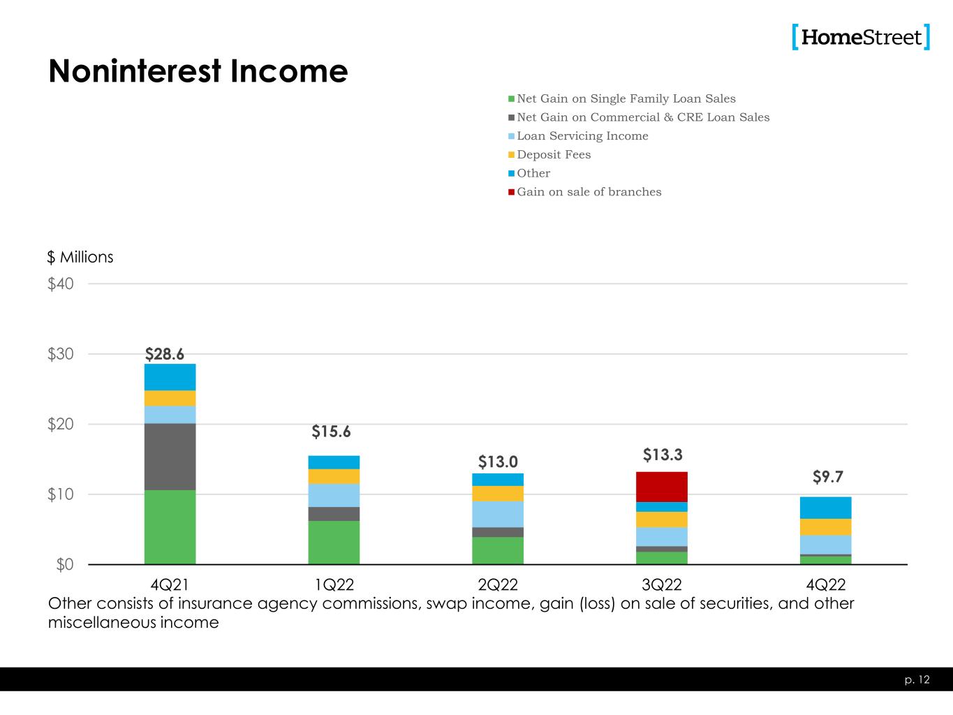 $28.6 $15.6 $13.0 $13.3 $9.7 $0 $10 $20 $30 $40 4Q21 1Q22 2Q22 3Q22 4Q22 Net Gain on Single Family Loan Sales Net Gain on Commercial & CRE Loan Sales Loan Servicing Income Deposit Fees Other Gain on sale of branches Noninterest Income p. 12 $ Millions Other consists of insurance agency commissions, swap income, gain (loss) on sale of securities, and other miscellaneous income