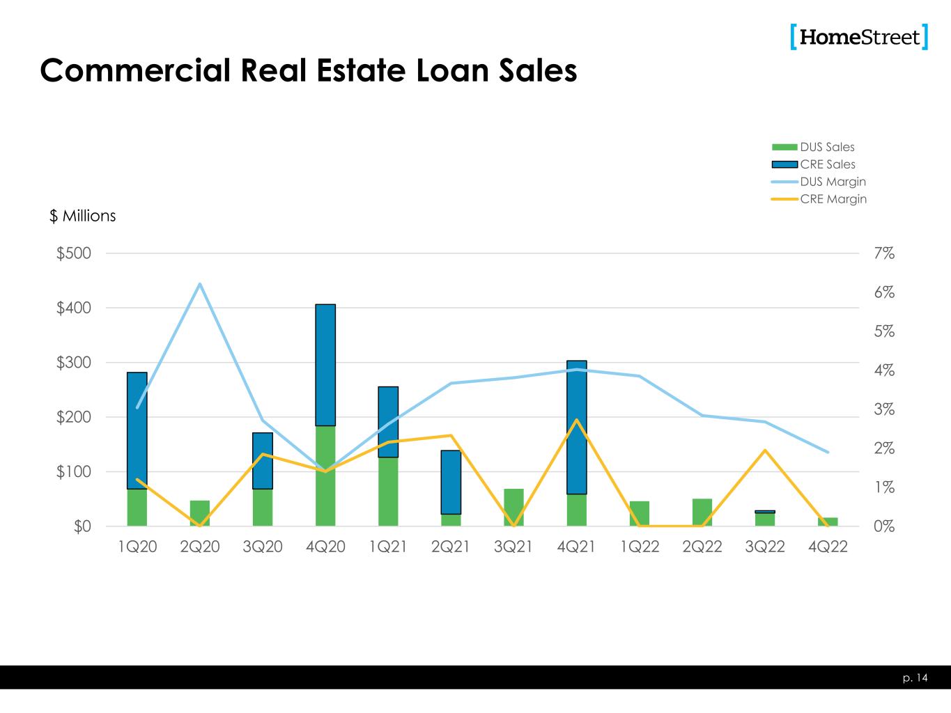 512 393 377 268 226 139 88 41 624 563 414 361 239 173 110 525.12% 4.03% 3.78% 3.94% 2.73% 2.84% 2.03% 2.84% 0% 2% 4% 6% 8% 10% 12% 0 100 200 300 400 500 600 700 1Q21 2Q21 3Q21 4Q21 1Q22 2Q22 3Q22 4Q22 Single Family Loan Sales Rate Locks Loans Closed GOS Margin Rate Locks/Loan Closings, $ in millions Margin% Single Family Mortgage Banking p. 13 12% 10% 6% 3% 5% 0% 10% 20% 30% 40% 4Q21 1Q22 2Q22 3Q22 4Q22 Single Family Mortgage Banking as a % of Total Revenues