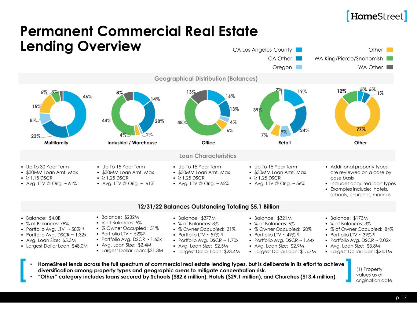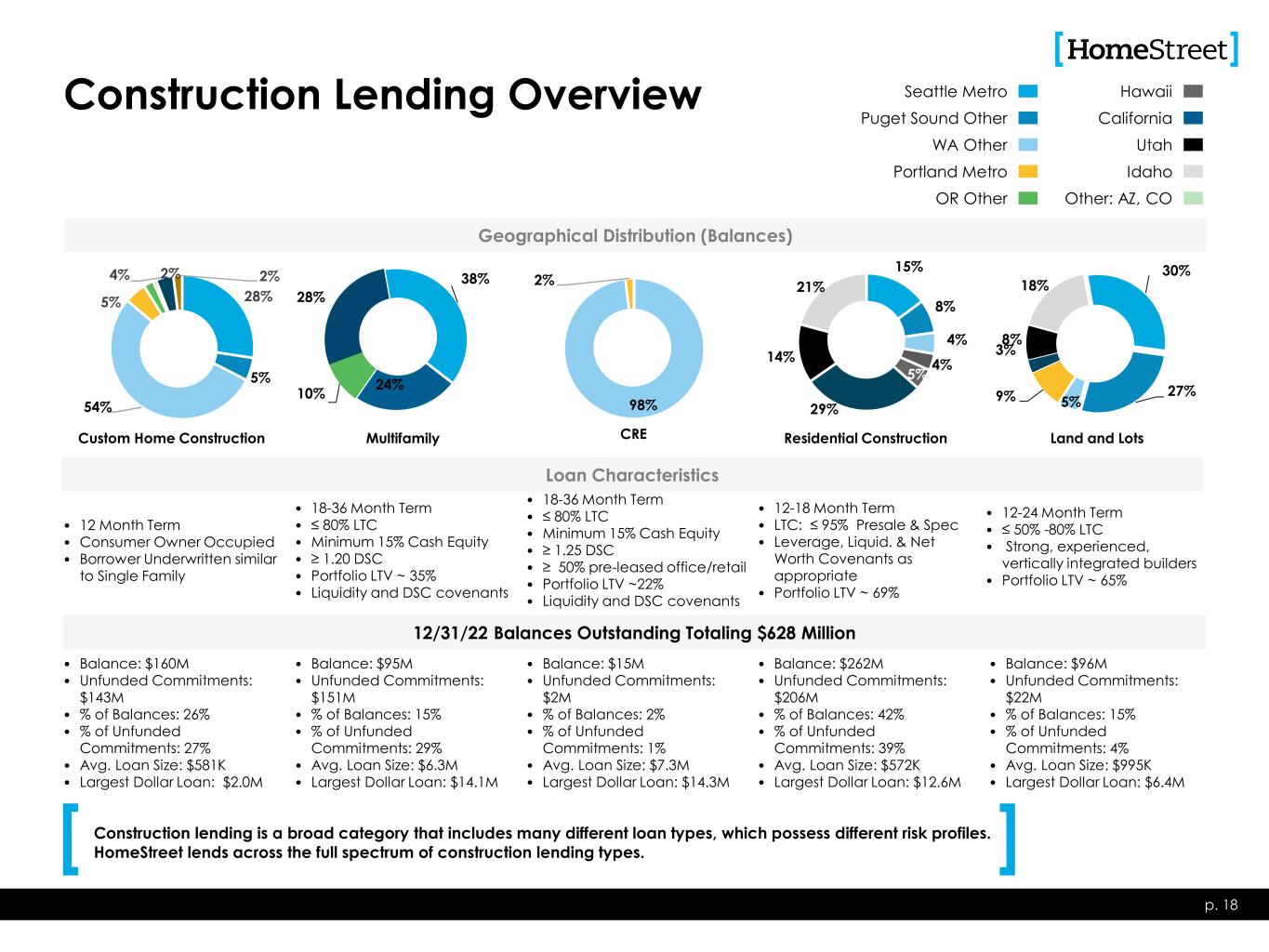 Permanent Commercial Real Estate Lending Overview • Up To 30 Year Term • $30MM Loan Amt. Max • ≥ 1.15 DSCR • Avg. LTV @ Orig. ~ 61% p. 17 Loan Characteristics • Up To 15 Year Term • $30MM Loan Amt. Max • ≥ 1.25 DSCR • Avg. LTV @ Orig. ~ 61% • Up To 15 Year Term • $30MM Loan Amt. Max • ≥ 1.25 DSCR • Avg. LTV @ Orig. ~ 65% • Up To 15 Year Term • $30MM Loan Amt. Max • ≥ 1.25 DSCR • Avg. LTV @ Orig. ~ 56% • Additional property types are reviewed on a case by case basis • Includes acquired loan types • Examples include: hotels, schools, churches, marinas • Balance: $4.0B • % of Balances: 78% • Portfolio Avg. LTV ~ 58%(1) • Portfolio Avg. DSCR ~ 1.32x • Avg. Loan Size: $5.3M • Largest Dollar Loan: $48.0M 12/31/22 Balances Outstanding Totaling $5.1 Billion • Balance: $232M • % of Balances: 5% • % Owner Occupied: 51% • Portfolio LTV ~ 52%(1) • Portfolio Avg. DSCR ~ 1.63x • Avg. Loan Size: $2.4M • Largest Dollar Loan: $21.3M • Balance: $377M • % of Balances: 8% • % Owner Occupied: 31% • Portfolio LTV ~ 57%(1) • Portfolio Avg. DSCR ~ 1.70x • Avg. Loan Size: $2.5M • Largest Dollar Loan: $23.4M • Balance: $321M • % of Balances: 6% • % Owner Occupied: 20% • Portfolio LTV ~ 49%(1) • Portfolio Avg. DSCR ~ 1.64x • Avg. Loan Size: $2.9M • Largest Dollar Loan: $15.7M • Balance: $173M • % of Balances: 3% • % of Owner Occupied: 84% • Portfolio LTV ~ 39%(1) • Portfolio Avg. DSCR ~ 2.02x • Avg. Loan Size: $3.8M • Largest Dollar Loan: $24.1M 46% 22% 8% 15% 6% 3% Geographical Distribution (Balances) Multifamily 14% 28% 2%4% 44% 8% Industrial / Warehouse 16% 13% 4% 6% 48% 13% Office 19% 24%9% 7% 39% 2% Retail 5% 5% 1% 77% 12% Other CA Los Angeles County CA Other Oregon Other WA King/Pierce/Snohomish WA Other (1) Property values as of origination date. • HomeStreet lends across the full spectrum of commercial real estate lending types, but is deliberate in its effort to achieve diversification among property types and geographic areas to mitigate concentration risk. • “Other” category includes loans secured by Schools ($82.6 million), Hotels ($29.1 million), and Churches ($13.4 million).