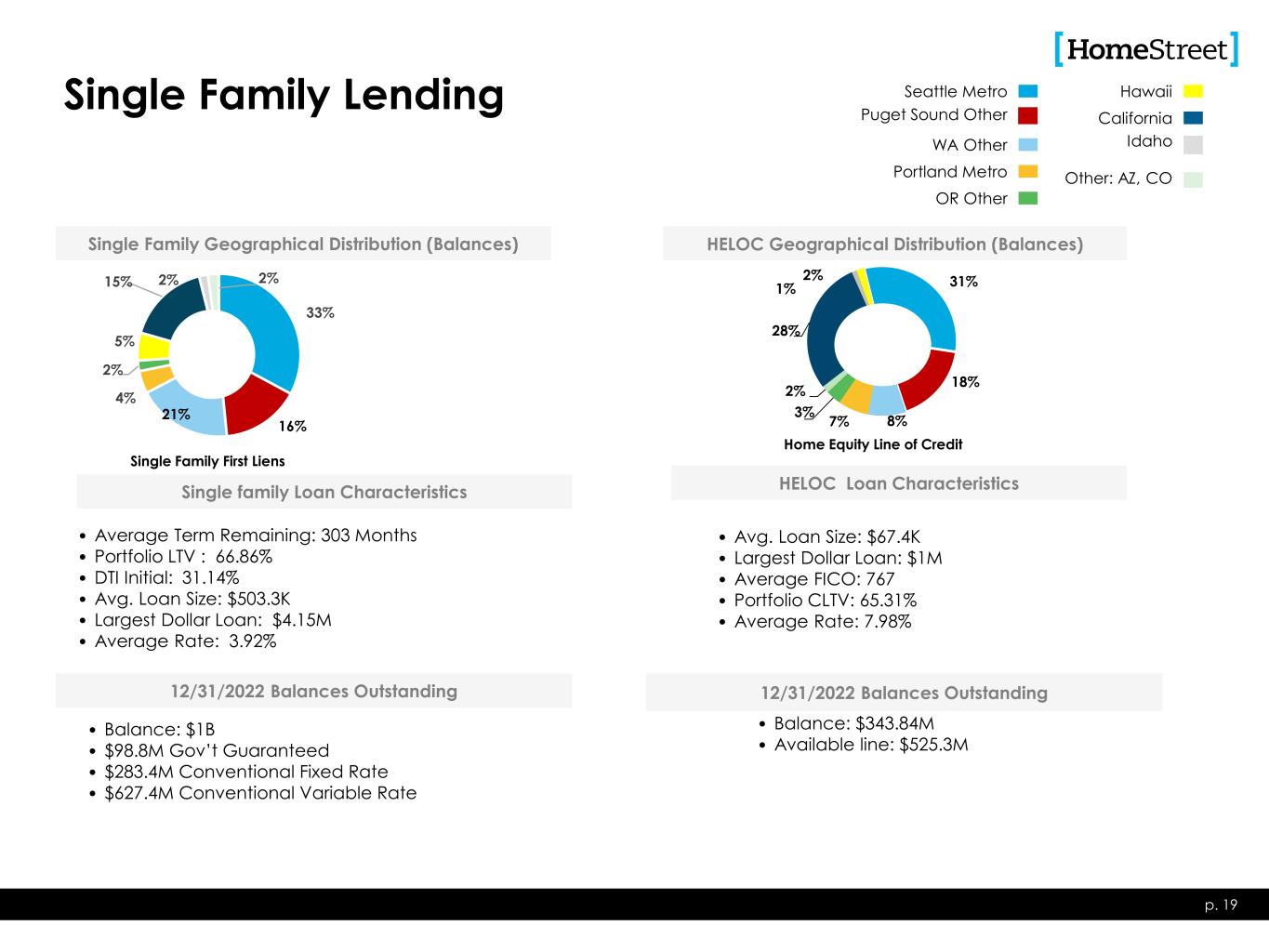 Construction Lending Overview • 12 Month Term • Consumer Owner Occupied • Borrower Underwritten similar to Single Family p. 18 Loan Characteristics • 18-36 Month Term • ≤ 80% LTC • Minimum 15% Cash Equity • ≥ 1.20 DSC • Portfolio LTV ~ 35% • Liquidity and DSC covenants • 18-36 Month Term • ≤ 80% LTC • Minimum 15% Cash Equity • ≥ 1.25 DSC • ≥ 50% pre-leased office/retail • Portfolio LTV ~22% • Liquidity and DSC covenants • 12-18 Month Term • LTC: ≤ 95% Presale & Spec • Leverage, Liquid. & Net Worth Covenants as appropriate • Portfolio LTV ~ 69% • 12-24 Month Term • ≤ 50% -80% LTC • Strong, experienced, vertically integrated builders • Portfolio LTV ~ 65% • Balance: $160M • Unfunded Commitments: $143M • % of Balances: 26% • % of Unfunded Commitments: 27% • Avg. Loan Size: $581K • Largest Dollar Loan: $2.0M 12/31/22 Balances Outstanding Totaling $628 Million • Balance: $95M • Unfunded Commitments: $151M • % of Balances: 15% • % of Unfunded Commitments: 29% • Avg. Loan Size: $6.3M • Largest Dollar Loan: $14.1M • Balance: $15M • Unfunded Commitments: $2M • % of Balances: 2% • % of Unfunded Commitments: 1% • Avg. Loan Size: $7.3M • Largest Dollar Loan: $14.3M • Balance: $262M • Unfunded Commitments: $206M • % of Balances: 42% • % of Unfunded Commitments: 39% • Avg. Loan Size: $572K • Largest Dollar Loan: $12.6M • Balance: $96M • Unfunded Commitments: $22M • % of Balances: 15% • % of Unfunded Commitments: 4% • Avg. Loan Size: $995K • Largest Dollar Loan: $6.4M 28% 5% 54% 5% 2%4% 2% Geographical Distribution (Balances) Custom Home Construction 38% 24%10% 28% Multifamily 98% 2% CRE 15% 8% 4% 4%5% 29% 14% 21% Residential Construction 30% 27% 5%9% 3% 8% 18% Land and Lots Seattle Metro Puget Sound Other WA Other Portland Metro OR Other Hawaii California Utah Idaho Other: AZ, CO Construction lending is a broad category that includes many different loan types, which possess different risk profiles. HomeStreet lends across the full spectrum of construction lending types.