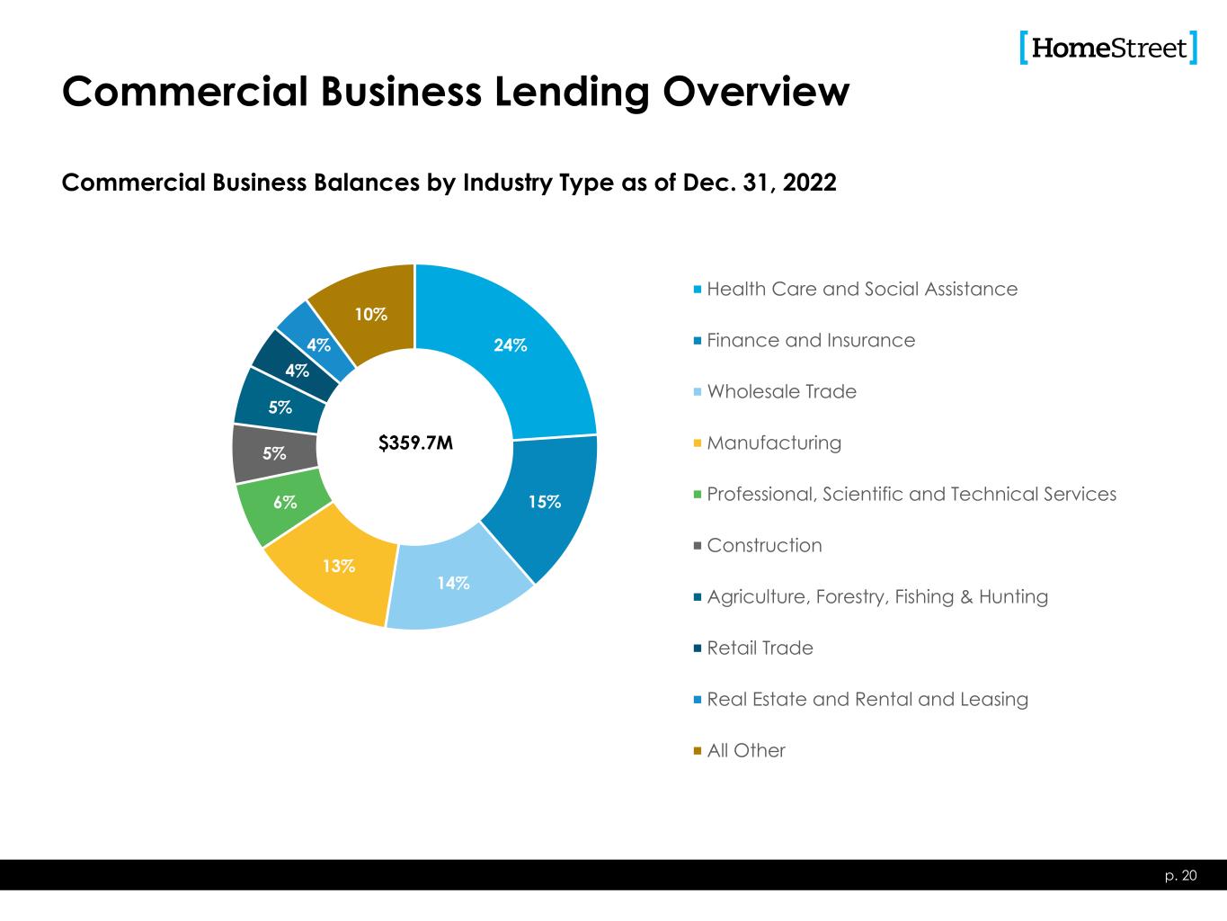Commercial Business Lending Overview Commercial Business Balances by Industry Type as of Dec. 31, 2022 p. 20 24% 15% 14% 13% 6% 5% 5% 4% 4% 10% Health Care and Social Assistance Finance and Insurance Wholesale Trade Manufacturing Professional, Scientific and Technical Services Construction Agriculture, Forestry, Fishing & Hunting Retail Trade Real Estate and Rental and Leasing All Other $359.7M