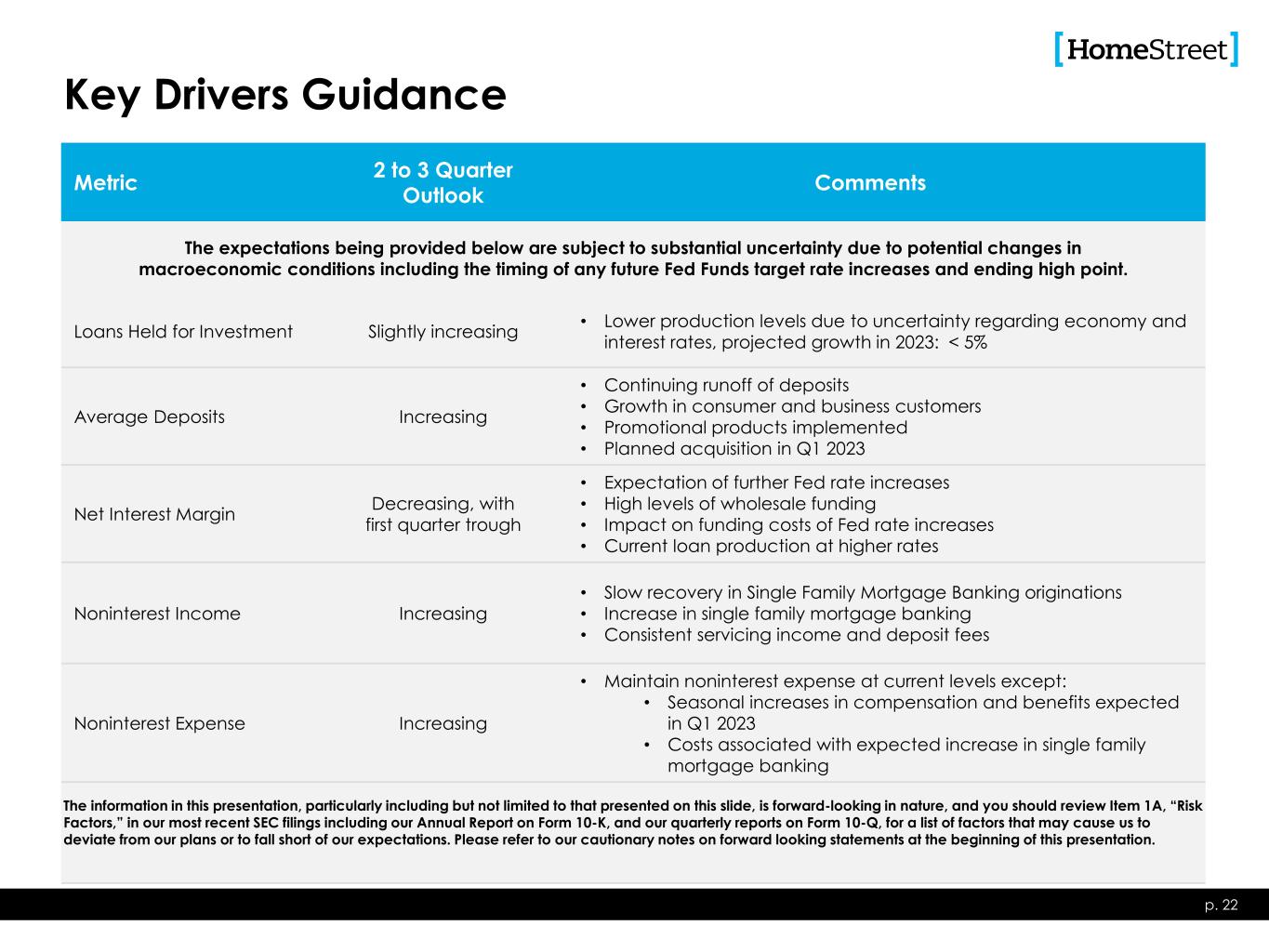 Key Drivers Guidance Metric 2 to 3 Quarter Outlook Comments The expectations being provided below are subject to substantial uncertainty due to potential changes in macroeconomic conditions including the timing of any future Fed Funds target rate increases and ending high point. Loans Held for Investment Slightly increasing • Lower production levels due to uncertainty regarding economy and interest rates, projected growth in 2023: < 5% Average Deposits Increasing • Continuing runoff of deposits • Growth in consumer and business customers • Promotional products implemented • Planned acquisition in Q1 2023 Net Interest Margin Decreasing, with first quarter trough • Expectation of further Fed rate increases • High levels of wholesale funding • Impact on funding costs of Fed rate increases • Current loan production at higher rates Noninterest Income Increasing • Slow recovery in Single Family Mortgage Banking originations • Increase in single family mortgage banking • Consistent servicing income and deposit fees Noninterest Expense Increasing • Maintain noninterest expense at current levels except: • Seasonal increases in compensation and benefits expected in Q1 2023 • Costs associated with expected increase in single family mortgage banking p. 22 The information in this presentation, particularly including but not limited to that presented on this slide, is forward-looking in nature, and you should review Item 1A, “Risk Factors,” in our most recent SEC filings including our Annual Report on Form 10-K, and our quarterly reports on Form 10-Q, for a list of factors that may cause us to deviate from our plans or to fall short of our expectations. Please refer to our cautionary notes on forward looking statements at the beginning of this presentation.