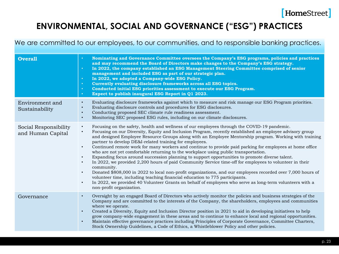 We are committed to our employees, to our communities, and to responsible banking practices. ENVIRONMENTAL, SOCIAL AND GOVERNANCE (“ESG”) PRACTICES p. 23 Overall • Nominating and Governance Committee oversees the Company’s ESG programs, policies and practices and may recommend the Board of Directors make changes to the Company’s ESG strategy. • In 2022, the company established an ESG Management Steering Committee comprised of senior management and included ESG as part of our strategic plan. • In 2022, we adopted a Company-wide ESG Policy. • Currently evaluating disclosure frameworks across all ESG topics. • Conducted initial ESG priorities assessment to execute our ESG Program. • Expect to publish inaugural ESG Report in Q1 2023. Environment and Sustainability • Evaluating disclosure frameworks against which to measure and risk manage our ESG Program priorities. • Evaluating disclosure controls and procedures for ESG disclosures. • Conducting proposed SEC climate rule readiness assessment. • Monitoring SEC proposed ESG rules, including on our climate disclosures. Social Responsibility and Human Capital • Focusing on the safety, health and wellness of our employees through the COVID-19 pandemic. • Focusing on our Diversity, Equity and Inclusion Program, recently established an employee advisory group and designed Employee Resource Groups along with an Employee Mentorship program. Working with training partner to develop DE&I-related training for employees. • Continued remote work for many workers and continue to provide paid parking for employees at home office who are not yet comfortable returning to the workplace using public transportation. • Expanding focus around succession planning to support opportunities to promote diverse talent. • In 2022, we provided 2,200 hours of paid Community Service time-off for employees to volunteer in their community. • Donated $808,000 in 2022 to local non-profit organizations, and our employees recorded over 7,000 hours of volunteer time, including teaching financial education to 775 participants. • In 2022, we provided 40 Volunteer Grants on behalf of employees who serve as long-term volunteers with a non-profit organization. Governance • Oversight by an engaged Board of Directors who actively monitor the policies and business strategies of the Company and are committed to the interests of the Company, the shareholders, employees and communities where we operate. • Created a Diversity, Equity and Inclusion Director position in 2021 to aid in developing initiatives to help grow company-wide engagement in these areas and to continue to enhance local and regional opportunities. • Maintain effective governance practices including Principles of Corporate Governance, Committee Charters, Stock Ownership Guidelines, a Code of Ethics, a Whistleblower Policy and other policies.