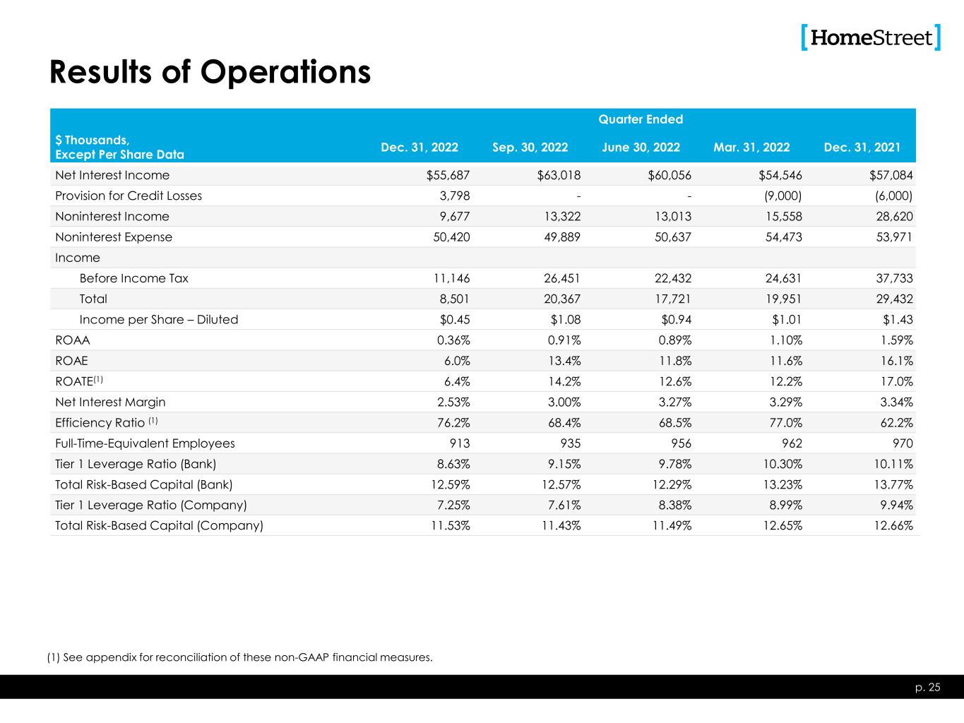 Results of Operations Quarter Ended $ Thousands, Except Per Share Data Dec. 31, 2022 Sep. 30, 2022 June 30, 2022 Mar. 31, 2022 Dec. 31, 2021 Net Interest Income $55,687 $63,018 $60,056 $54,546 $57,084 Provision for Credit Losses 3,798 - - (9,000) (6,000) Noninterest Income 9,677 13,322 13,013 15,558 28,620 Noninterest Expense 50,420 49,889 50,637 54,473 53,971 Income Before Income Tax 11,146 26,451 22,432 24,631 37,733 Total 8,501 20,367 17,721 19,951 29,432 Income per Share – Diluted $0.45 $1.08 $0.94 $1.01 $1.43 ROAA 0.36% 0.91% 0.89% 1.10% 1.59% ROAE 6.0% 13.4% 11.8% 11.6% 16.1% ROATE(1) 6.4% 14.2% 12.6% 12.2% 17.0% Net Interest Margin 2.53% 3.00% 3.27% 3.29% 3.34% Efficiency Ratio (1) 76.2% 68.4% 68.5% 77.0% 62.2% Full-Time-Equivalent Employees 913 935 956 962 970 Tier 1 Leverage Ratio (Bank) 8.63% 9.15% 9.78% 10.30% 10.11% Total Risk-Based Capital (Bank) 12.59% 12.57% 12.29% 13.23% 13.77% Tier 1 Leverage Ratio (Company) 7.25% 7.61% 8.38% 8.99% 9.94% Total Risk-Based Capital (Company) 11.53% 11.43% 11.49% 12.65% 12.66% p. 25 (1) See appendix for reconciliation of these non-GAAP financial measures.