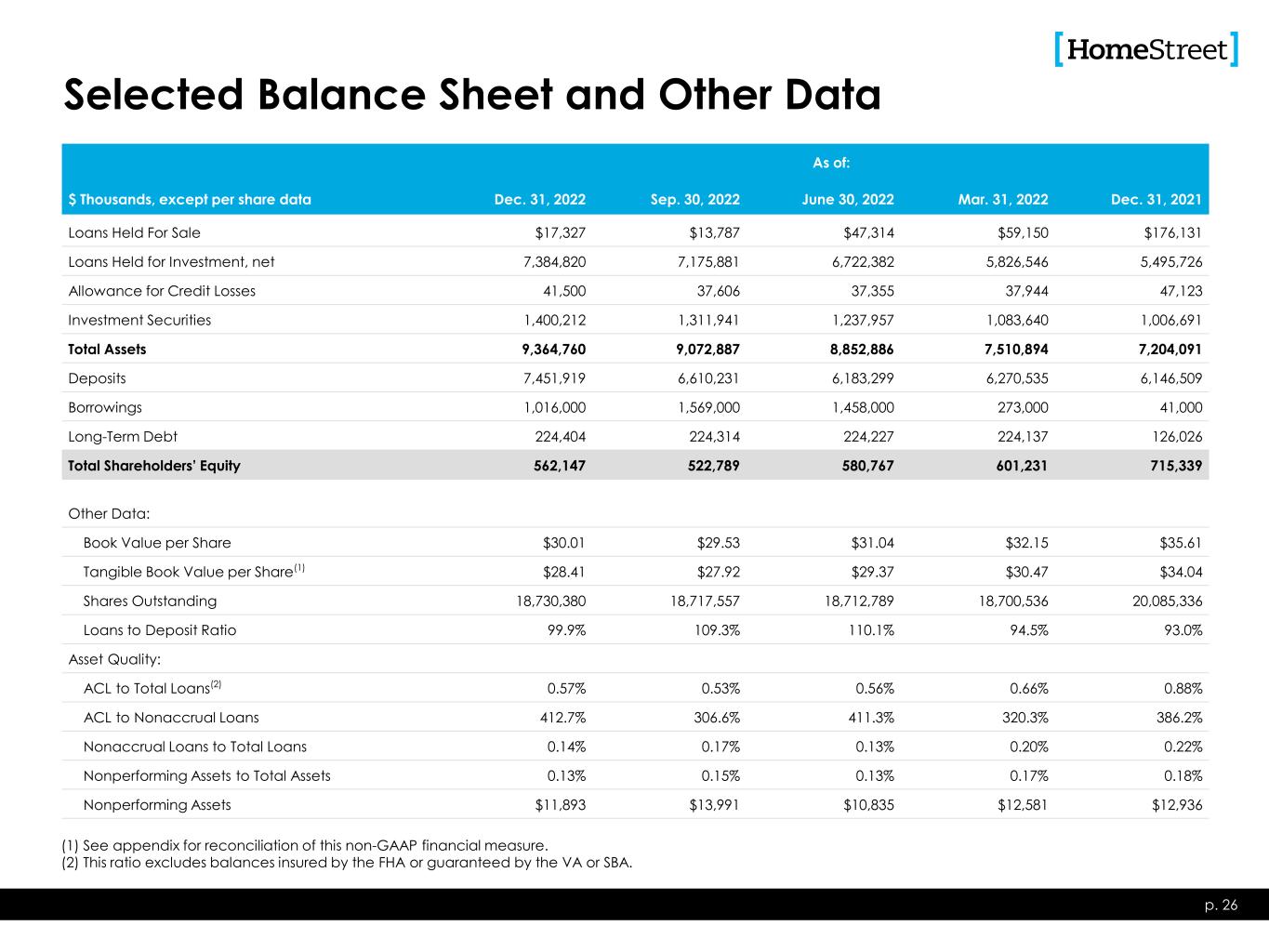 Selected Balance Sheet and Other Data As of: $ Thousands, except per share data Dec. 31, 2022 Sep. 30, 2022 June 30, 2022 Mar. 31, 2022 Dec. 31, 2021 Loans Held For Sale $17,327 $13,787 $47,314 $59,150 $176,131 Loans Held for Investment, net 7,384,820 7,175,881 6,722,382 5,826,546 5,495,726 Allowance for Credit Losses 41,500 37,606 37,355 37,944 47,123 Investment Securities 1,400,212 1,311,941 1,237,957 1,083,640 1,006,691 Total Assets 9,364,760 9,072,887 8,852,886 7,510,894 7,204,091 Deposits 7,451,919 6,610,231 6,183,299 6,270,535 6,146,509 Borrowings 1,016,000 1,569,000 1,458,000 273,000 41,000 Long-Term Debt 224,404 224,314 224,227 224,137 126,026 Total Shareholders’ Equity 562,147 522,789 580,767 601,231 715,339 Other Data: Book Value per Share $30.01 $29.53 $31.04 $32.15 $35.61 Tangible Book Value per Share(1) $28.41 $27.92 $29.37 $30.47 $34.04 Shares Outstanding 18,730,380 18,717,557 18,712,789 18,700,536 20,085,336 Loans to Deposit Ratio 99.9% 109.3% 110.1% 94.5% 93.0% Asset Quality: ACL to Total Loans(2) 0.57% 0.53% 0.56% 0.66% 0.88% ACL to Nonaccrual Loans 412.7% 306.6% 411.3% 320.3% 386.2% Nonaccrual Loans to Total Loans 0.14% 0.17% 0.13% 0.20% 0.22% Nonperforming Assets to Total Assets 0.13% 0.15% 0.13% 0.17% 0.18% Nonperforming Assets $11,893 $13,991 $10,835 $12,581 $12,936 p. 26 (1) See appendix for reconciliation of this non-GAAP financial measure. (2) This ratio excludes balances insured by the FHA or guaranteed by the VA or SBA.