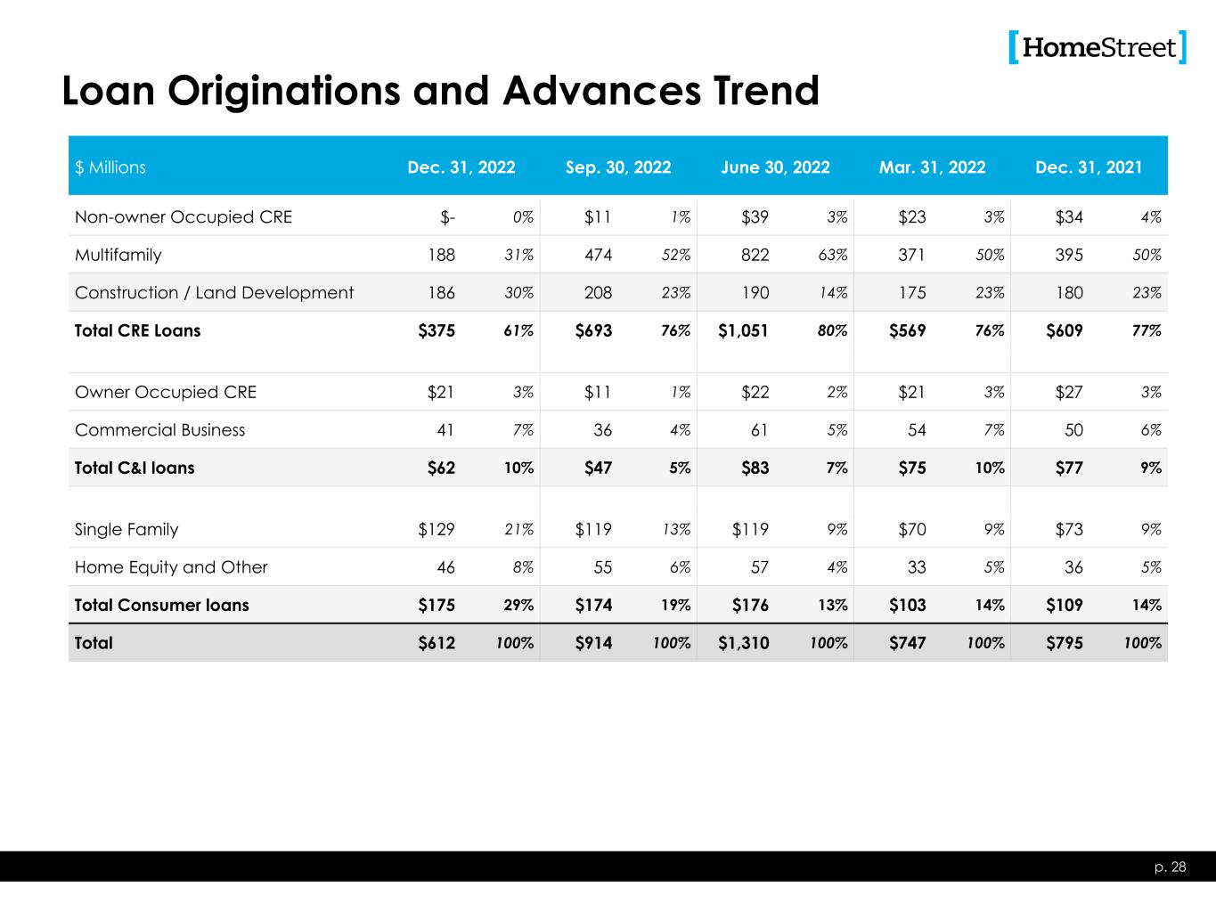 Loans Held for Investment Balance Trend p. 27 $ Millions Dec. 31, 2022 Sep. 30, 2022 June 30, 2022 Mar. 31, 2022 Dec. 31, 2021 Non-owner Occupied CRE $658 9% $666 9% $711 11% $699 12% $705 13% Multifamily 3,976 54% 3,924 54% 3,476 51% 2,730 47% 2,415 44% Construction / Land Development 627 8% 590 8% 570 8% 528 9% 496 9% Total CRE Loans $5,261 71% $5,180 71% $4,757 70% $3,957 68% $3,617 66% Owner Occupied CRE $443 6% $432 6% $470 7% $464 8% $458 8% Commercial Business 360 5% 362 5% 394 6% 388 6% 402 7% Total C&I Loans $803 11% $794 11% $864 13% $852 14% $860 15% Single Family $1,009 13% $907 13% $822 12% $759 13% $763 14% Home Equity and Other 353 5% 332 5% 317 5% 296 5% 303 5% Total Consumer Loans $1,362 18% $1,239 18% $1,139 17% $1,055 18% $1,066 19% Total Loans Held for Investment $7,426 100% $7,213 100% $6,760 100% $5,864 100% $5,542 100%