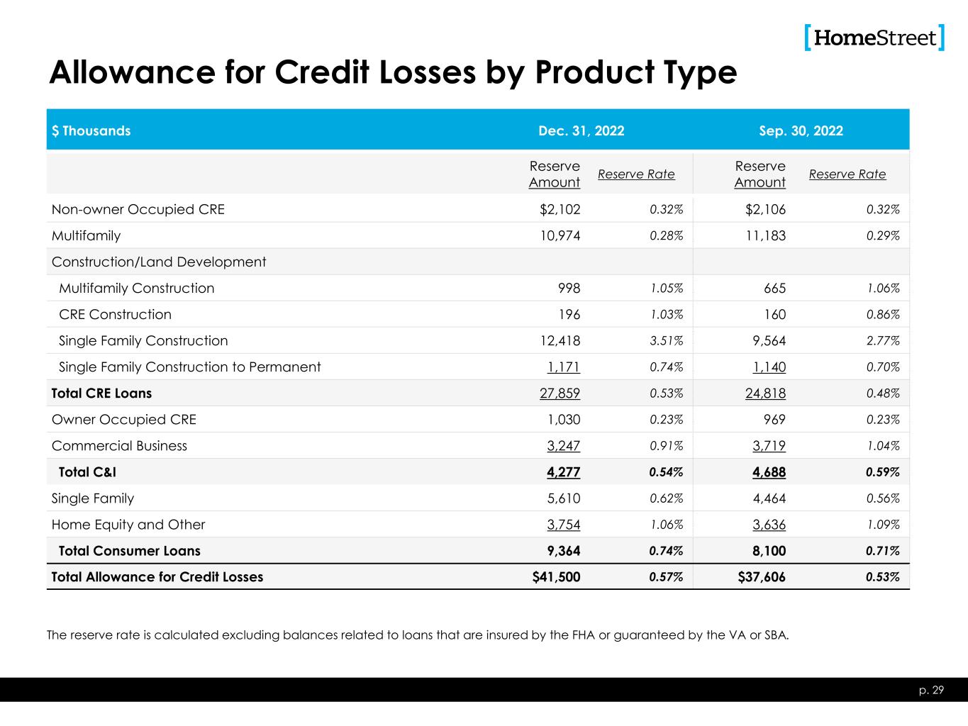Allowance for Credit Losses by Product Type p. 29 $ Thousands Dec. 31, 2022 Sep. 30, 2022 Reserve Amount Reserve Rate Reserve Amount Reserve Rate Non-owner Occupied CRE $2,102 0.32% $2,106 0.32% Multifamily 10,974 0.28% 11,183 0.29% Construction/Land Development Multifamily Construction 998 1.05% 665 1.06% CRE Construction 196 1.03% 160 0.86% Single Family Construction 12,418 3.51% 9,564 2.77% Single Family Construction to Permanent 1,171 0.74% 1,140 0.70% Total CRE Loans 27,859 0.53% 24,818 0.48% Owner Occupied CRE 1,030 0.23% 969 0.23% Commercial Business 3,247 0.91% 3,719 1.04% Total C&I 4,277 0.54% 4,688 0.59% Single Family 5,610 0.62% 4,464 0.56% Home Equity and Other 3,754 1.06% 3,636 1.09% Total Consumer Loans 9,364 0.74% 8,100 0.71% Total Allowance for Credit Losses $41,500 0.57% $37,606 0.53% The reserve rate is calculated excluding balances related to loans that are insured by the FHA or guaranteed by the VA or SBA.